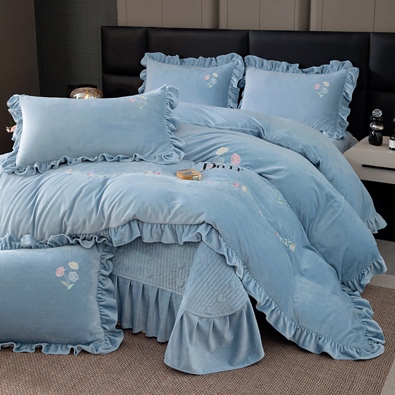 商品名称:畅畅家纺 2025新款宝宝绒绣花床盖四件套婴儿绒纯色牛奶绒四件套 湖蓝