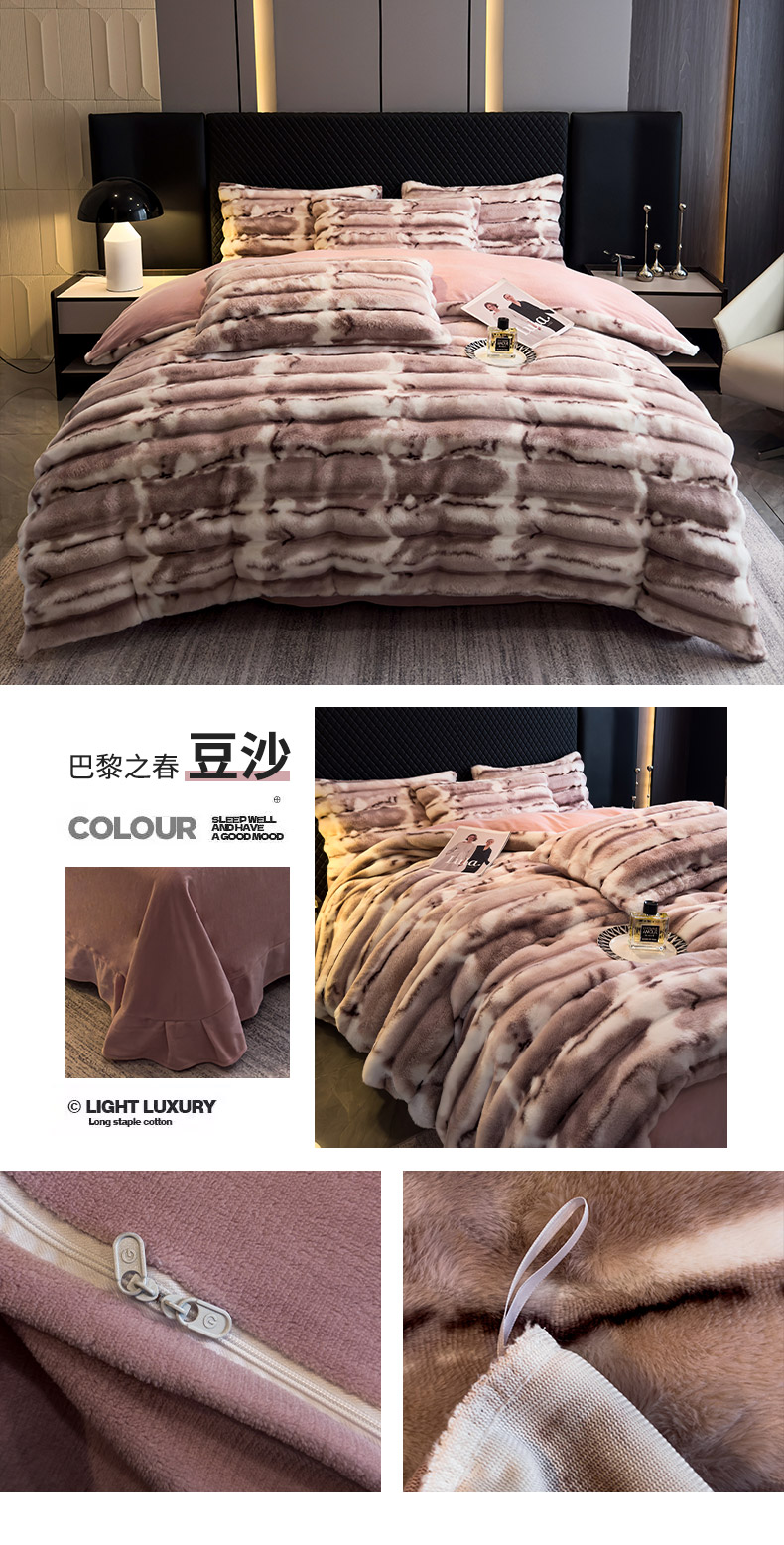 畅畅家纺 2025新款高克重10斤加厚轻奢扎染兔毛绒四件套-巴黎之春 巴黎之春-豆沙