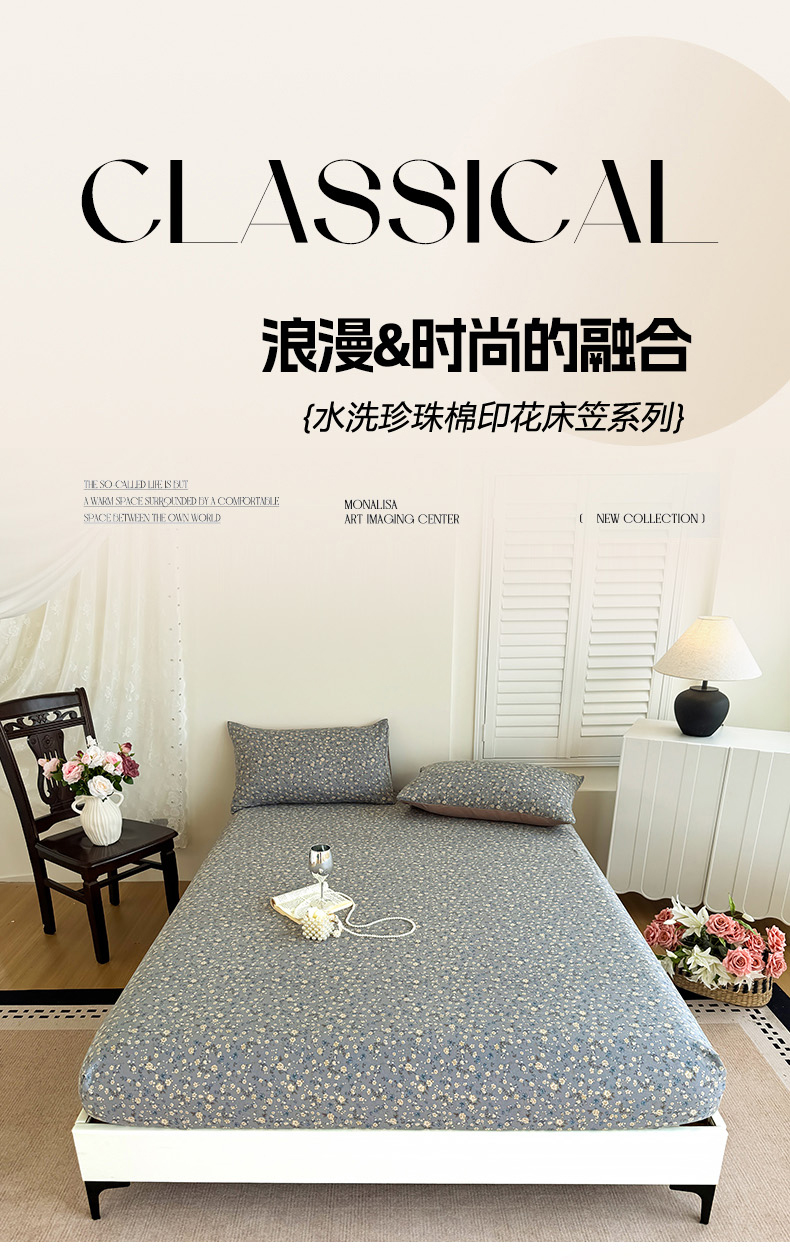 • 91家纺网 家纺一手货源 找家纺 卢赛尔 2025新款水洗珍珠棉皱皱纱印花床笠 秋草-灰