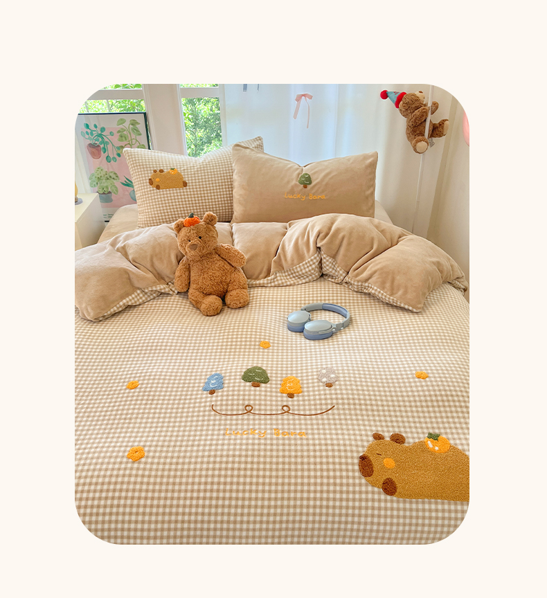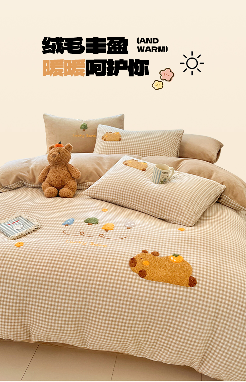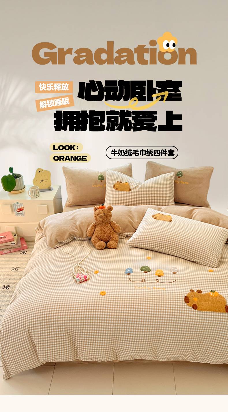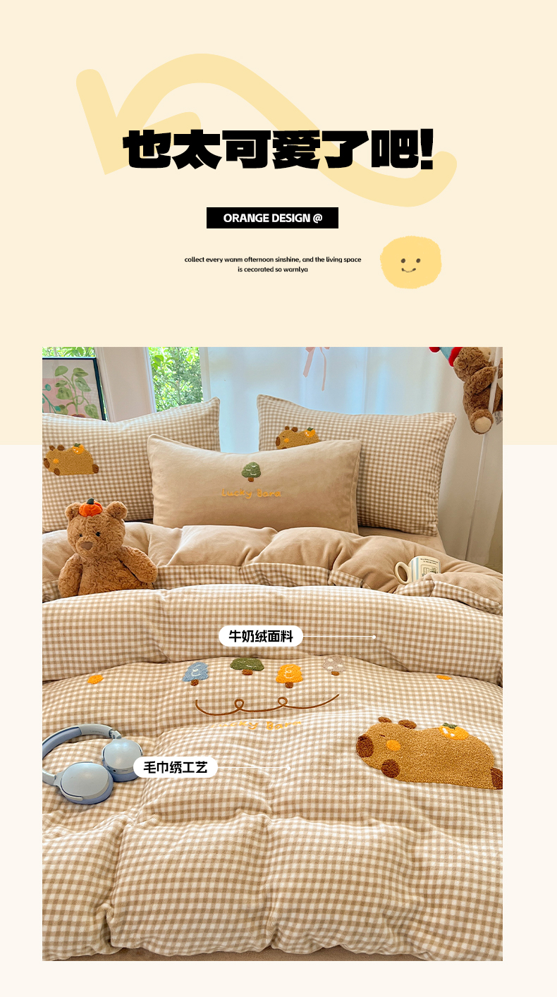 如一 2025新款卡通毛巾绣系列牛奶绒四件套第一批 卡皮柿子