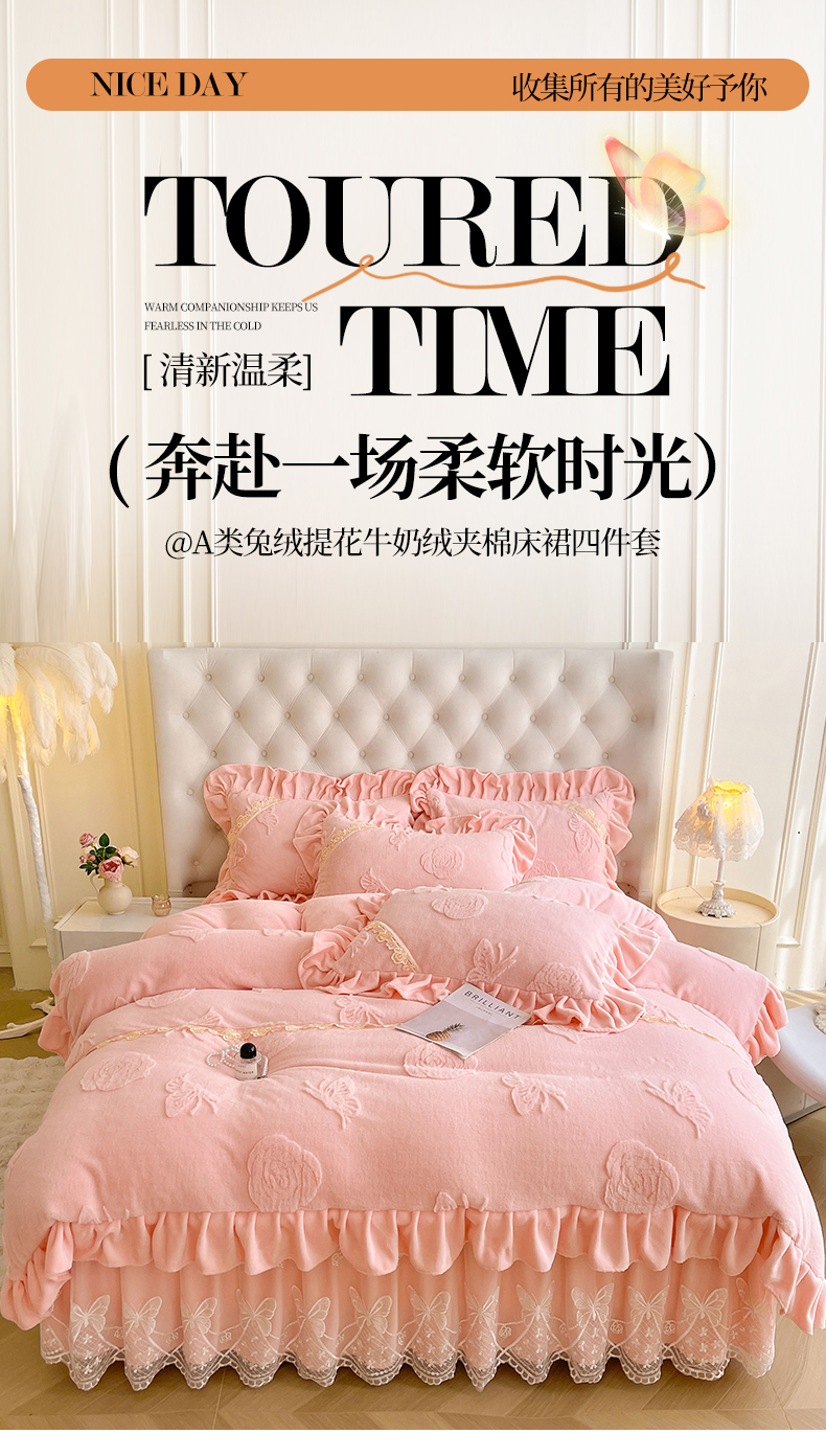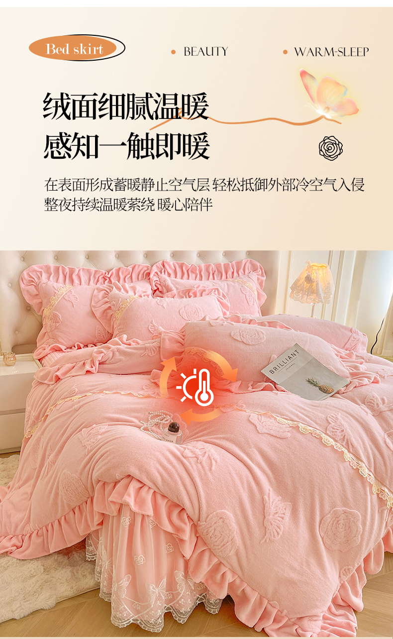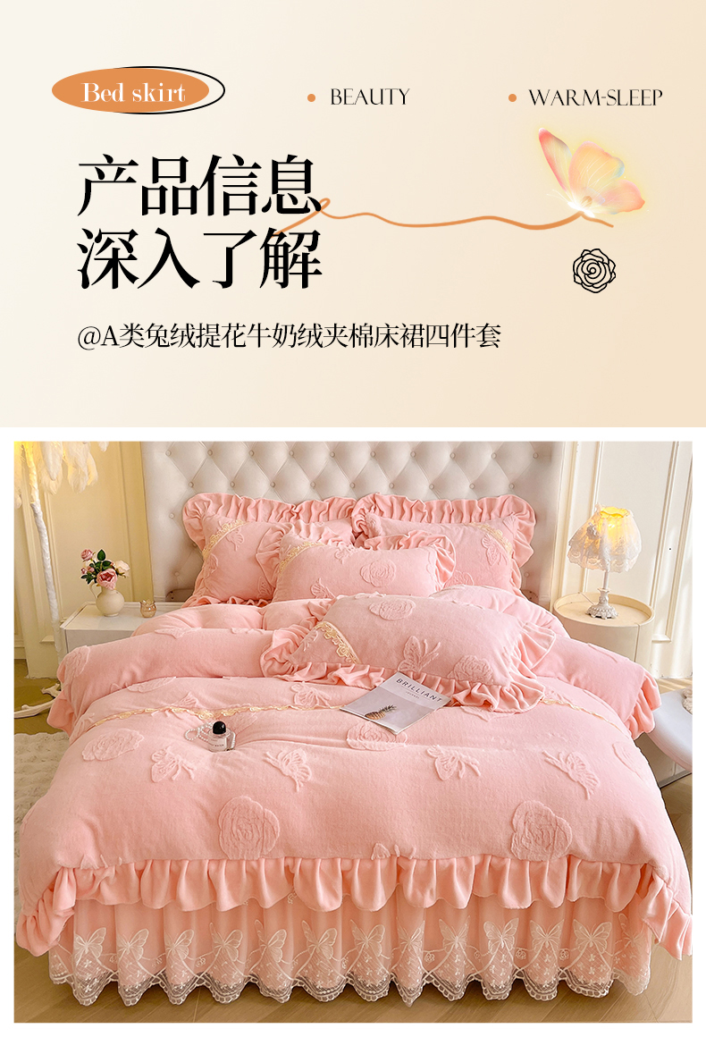 (总)宜凡家纺 2025新款兔绒提花牛奶绒夹棉床裙四件套,爱心 少女粉,爱心 粉紫,爱心 驼色,蝶舞 大红,蝶舞 米色,蝶舞 浅紫,蝶舞 玉色,简爱 苍青,简爱 豆沙紫,简爱 玉色,樱桃 苍青,樱桃 豆沙紫,樱桃 奶油白