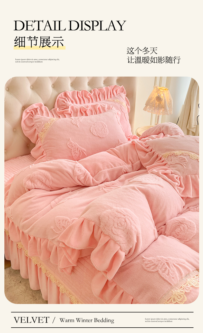 商品名称:宜凡家纺 2025新款兔绒提花花边牛奶绒床盖四件套 蝶恋花-仙女粉