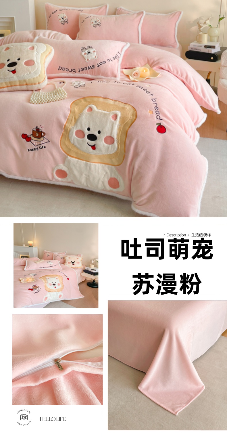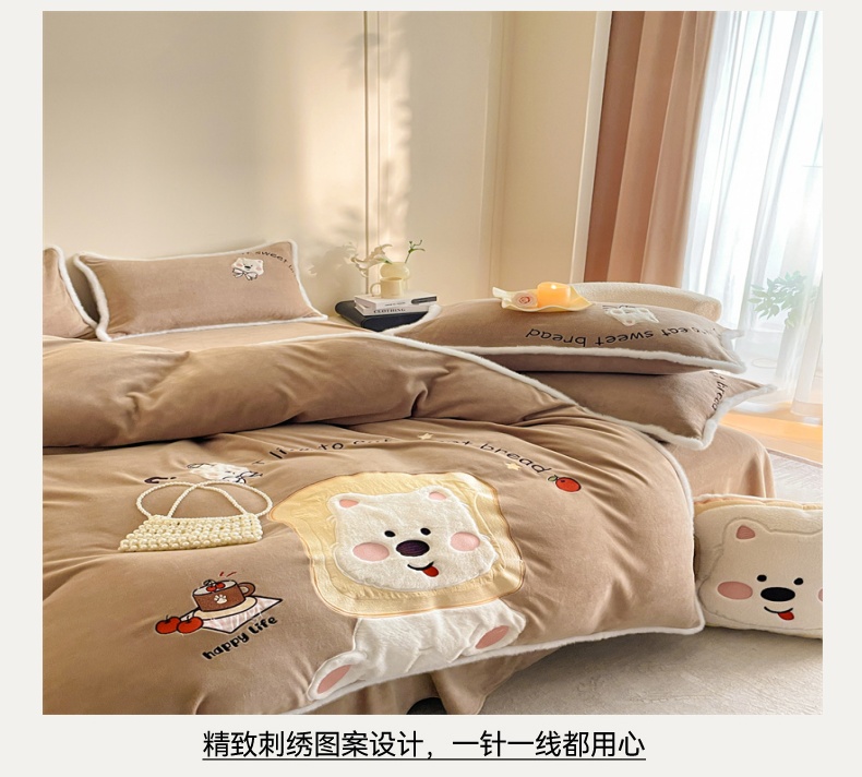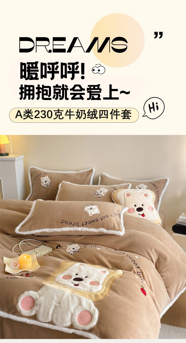 商品名称:梦舒羽 2025新款A类230克全消光刺绣贴布牛奶绒四件套学生宿舍床单款床上用品套件 吐司萌宠-实力咖