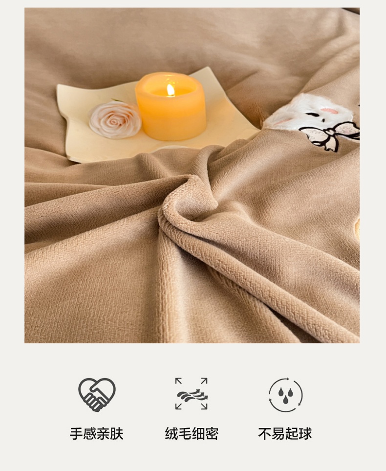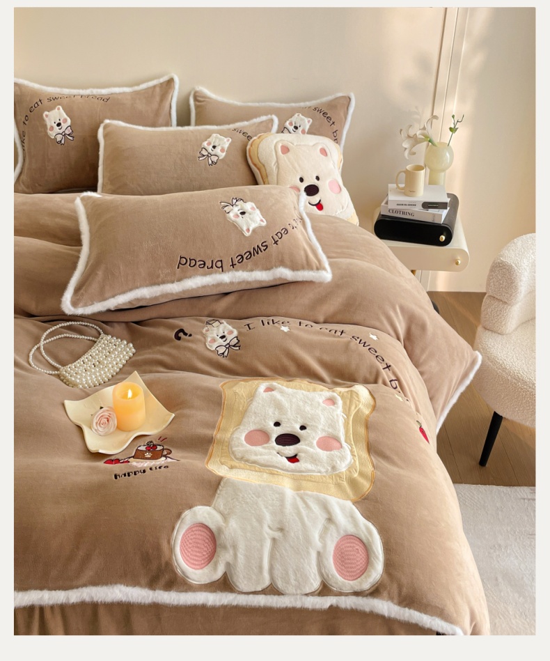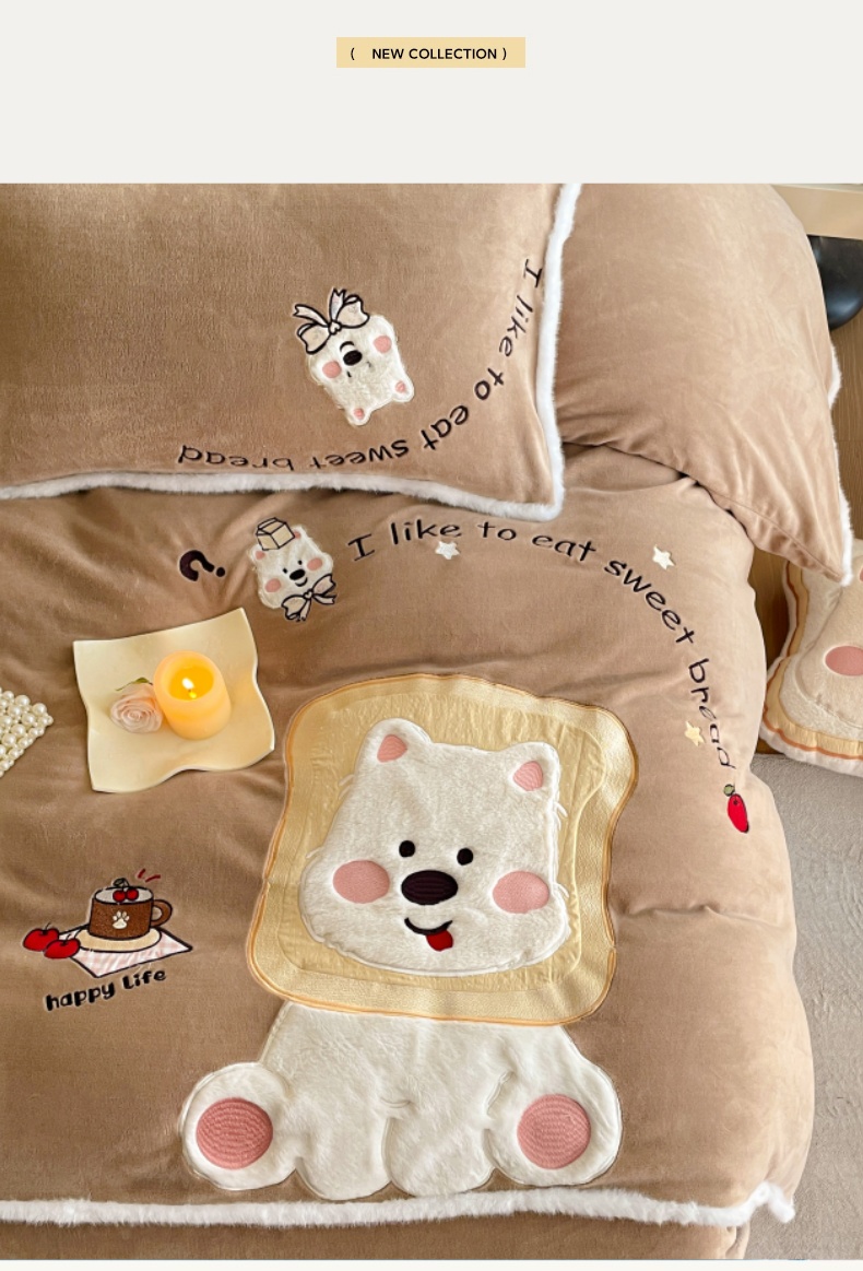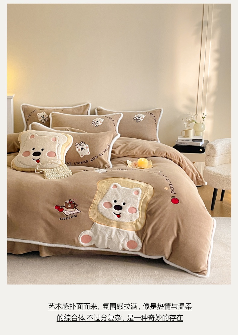 商品名称:梦舒羽 2025新款A类230克全消光刺绣贴布牛奶绒四件套学生宿舍床单款床上用品套件 吐司萌宠-实力咖