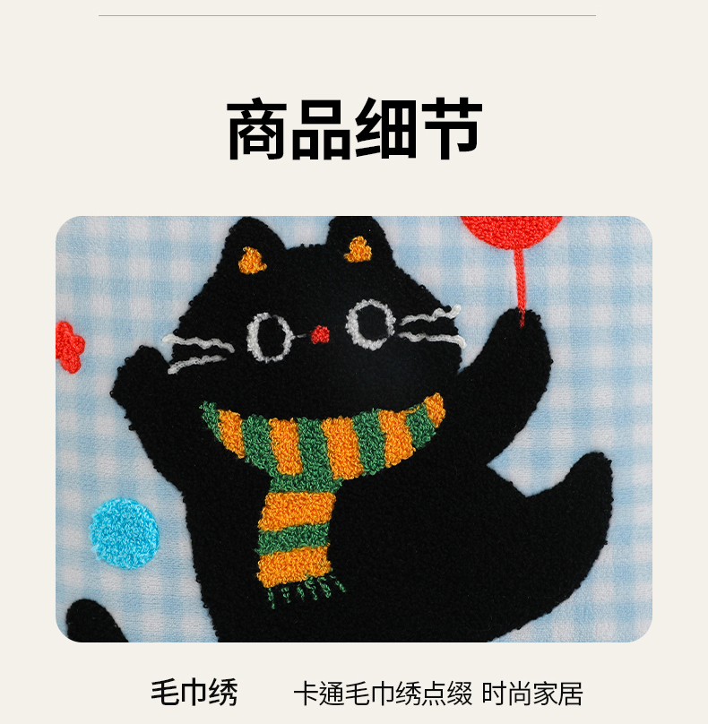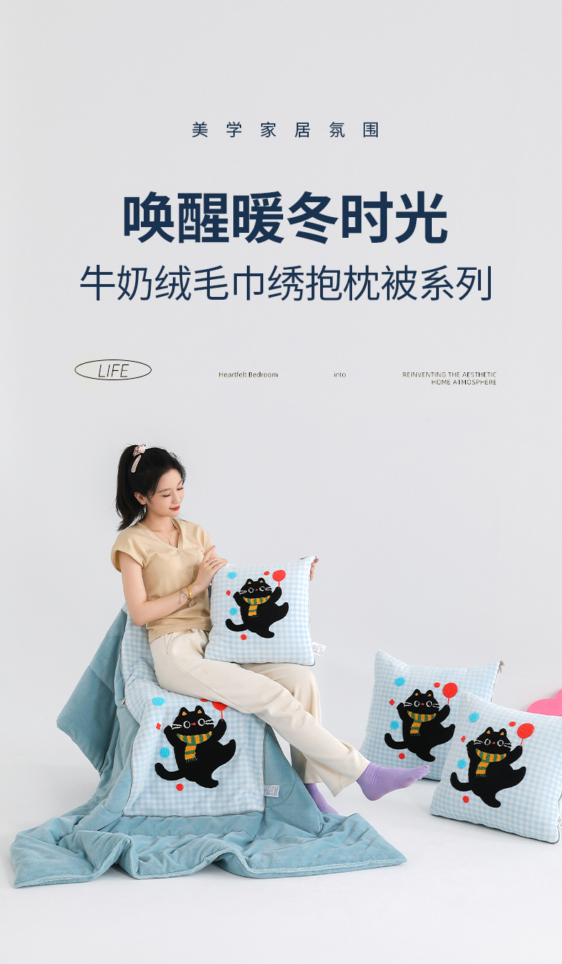 翰轩家居 2025新款卡通牛奶绒抱枕被毛巾绣系列 气球猫-蓝