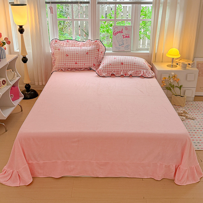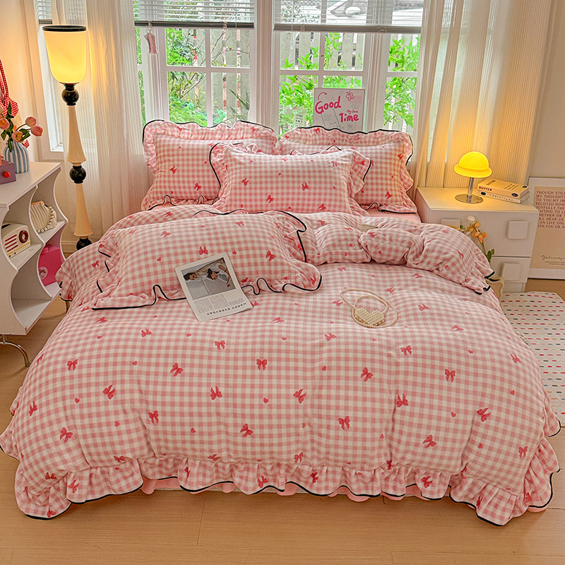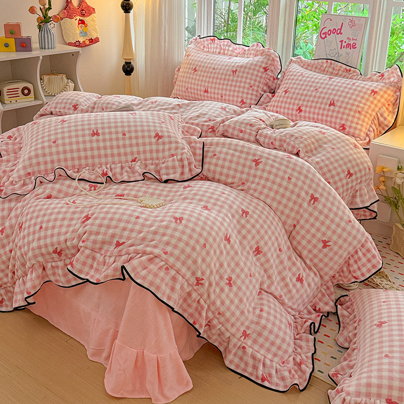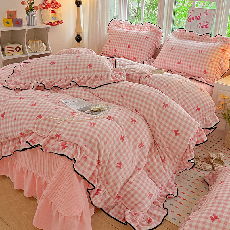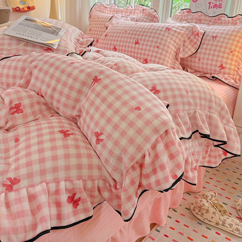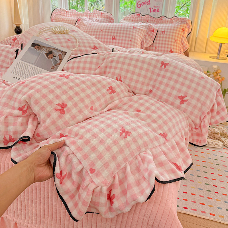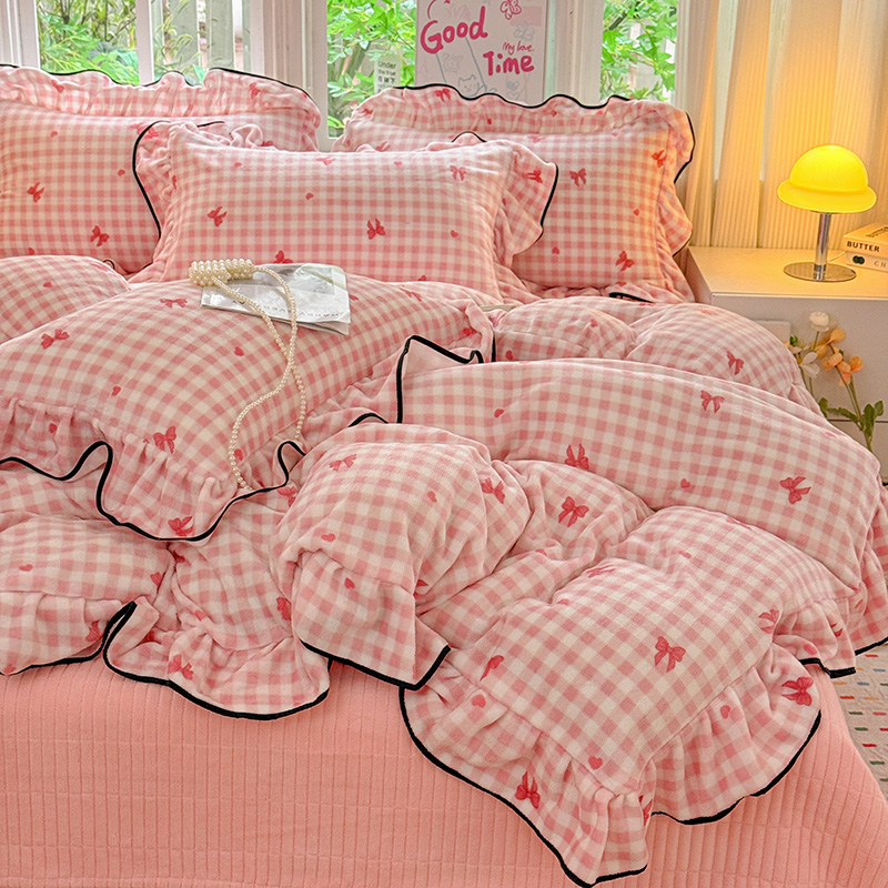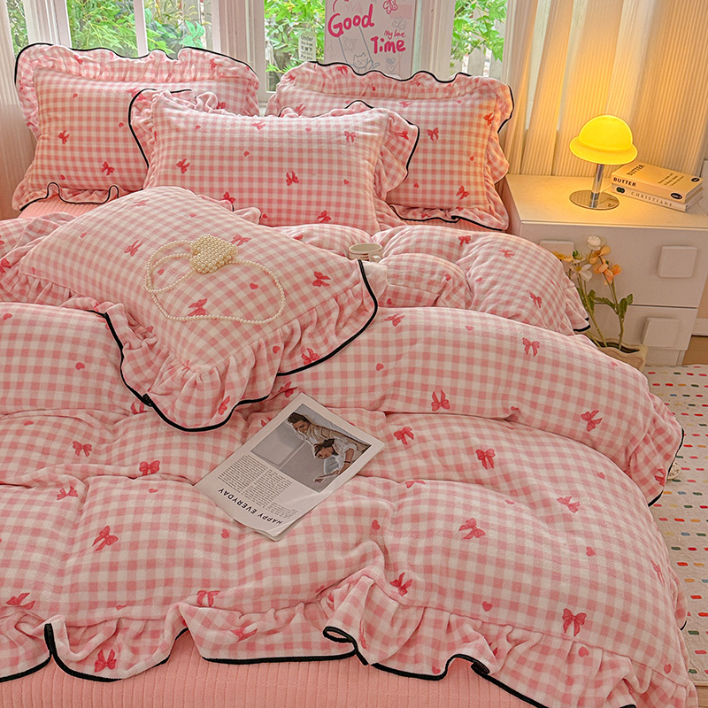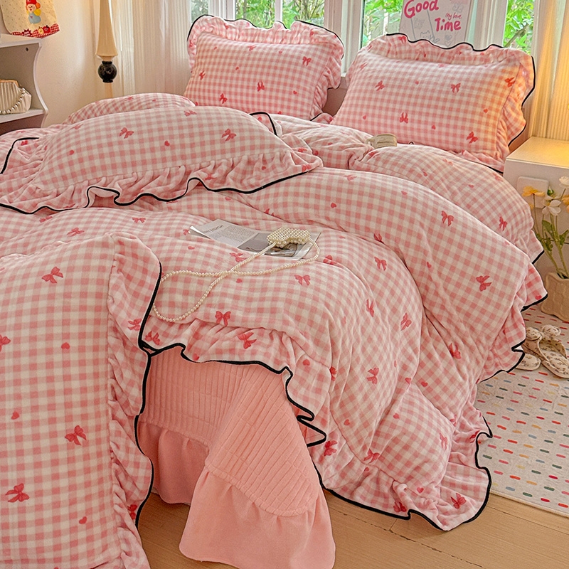 梦莱斯 2025新款加厚保暖双面牛奶绒四件套-黑色花边款 粉红蝴蝶结