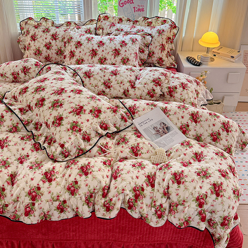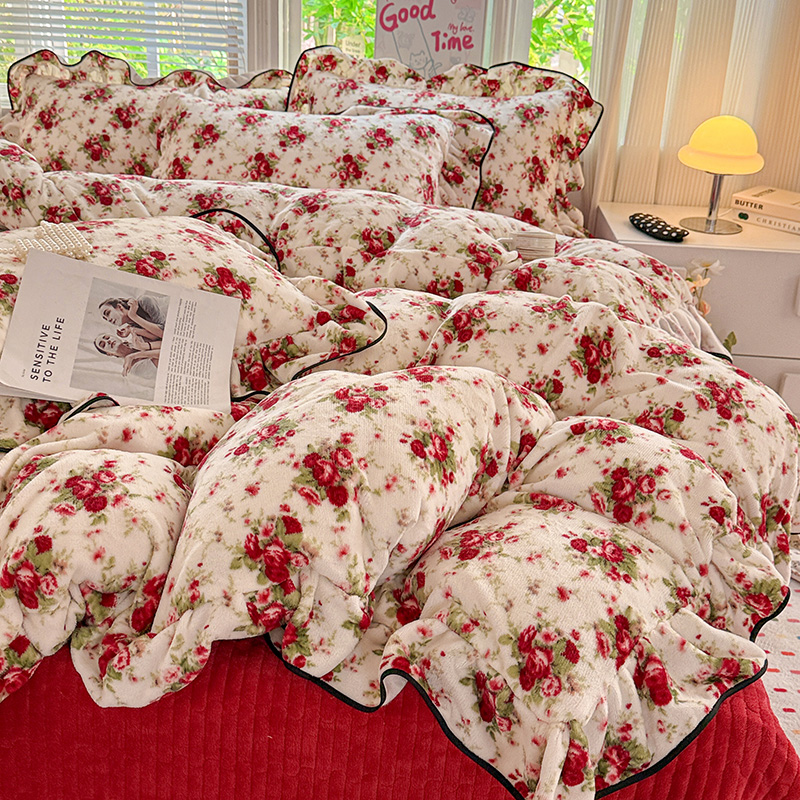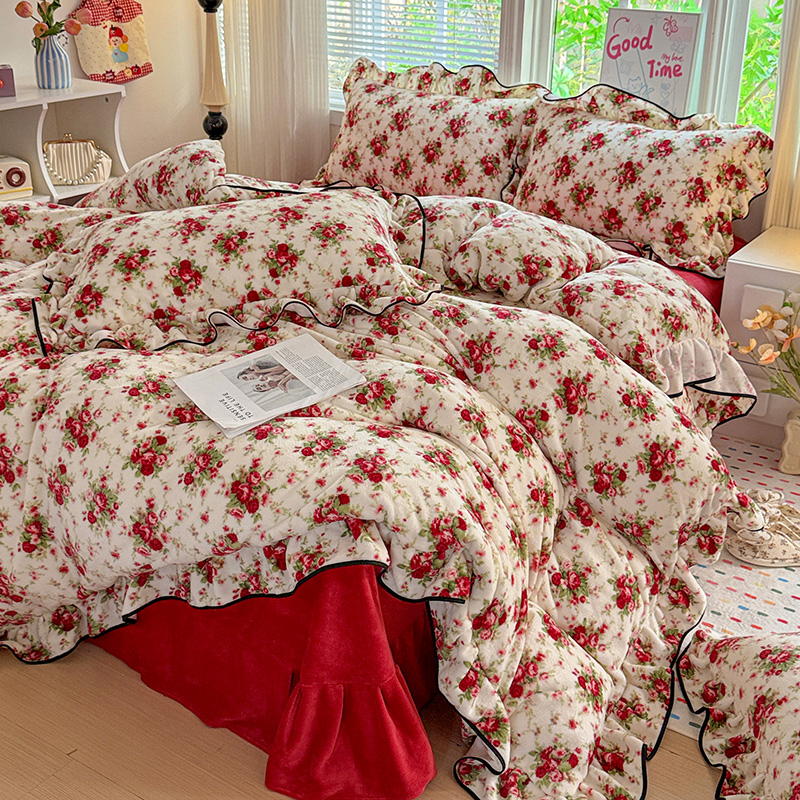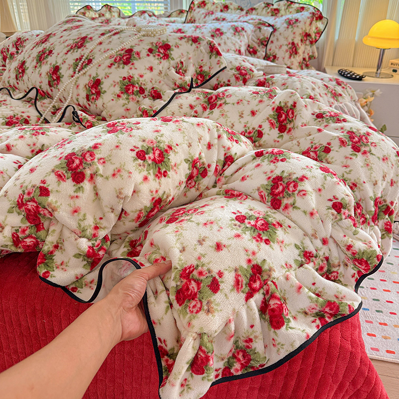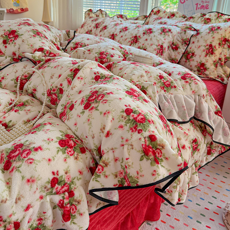 梦莱斯 2025新款加厚保暖双面牛奶绒四件套-黑色花边款 玫瑰之约 - 白