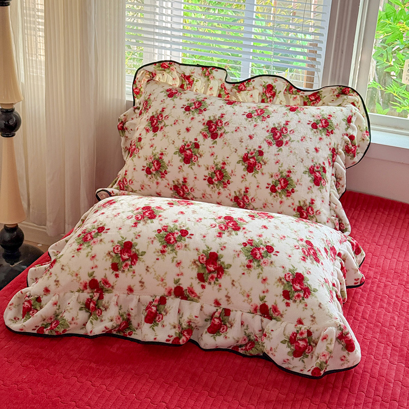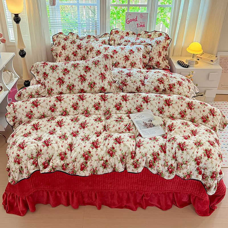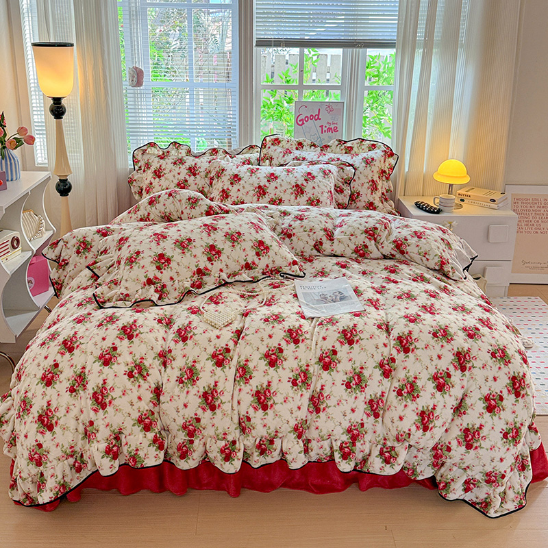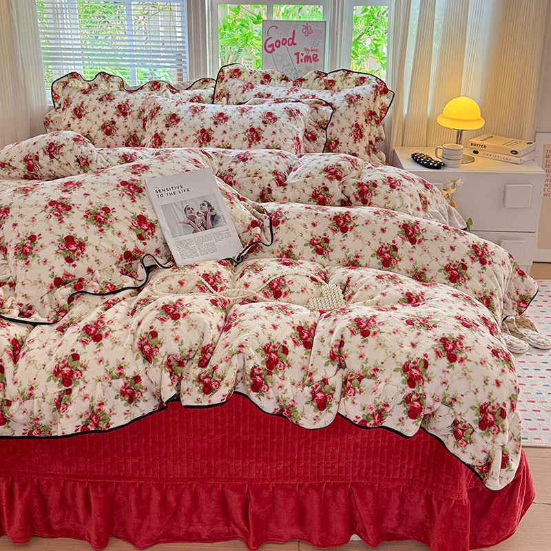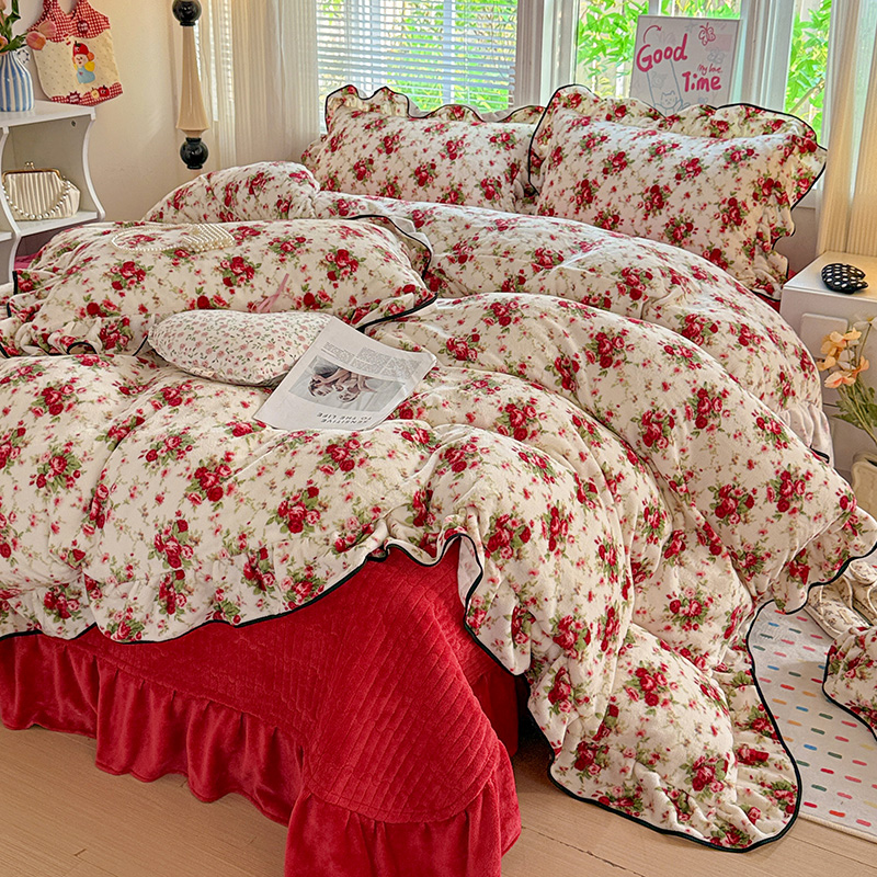 梦莱斯 2025新款加厚保暖双面牛奶绒四件套-黑色花边款 玫瑰之约 - 白