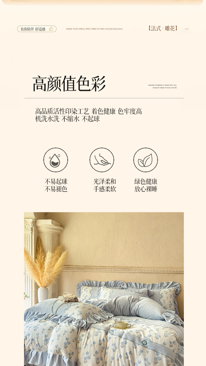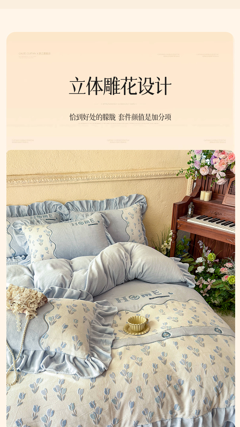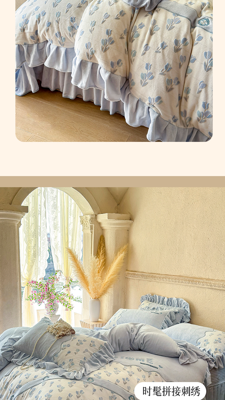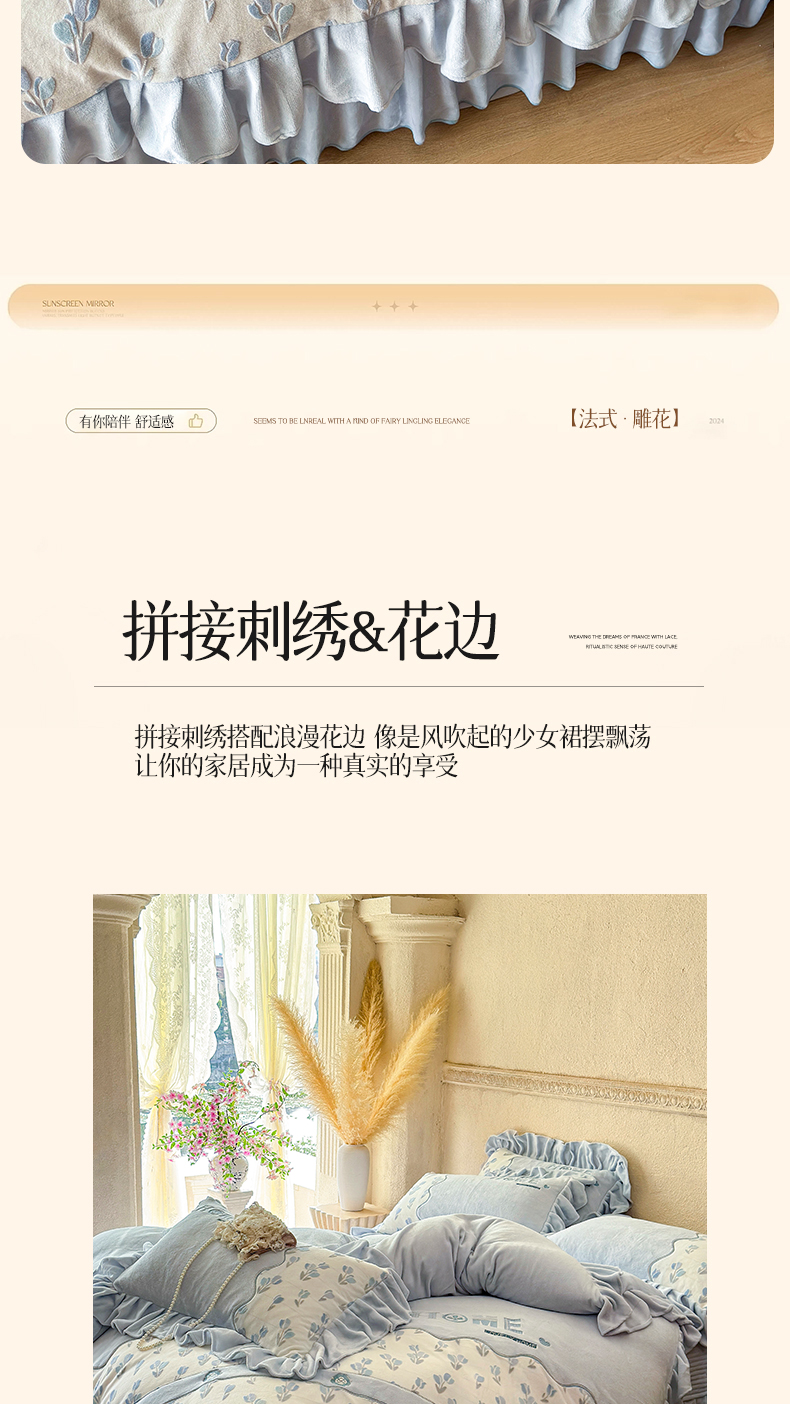 商品名称:宜凡家纺 2025新款牛奶绒雕花拼接刺绣床盖四件套 雾蓝漫织