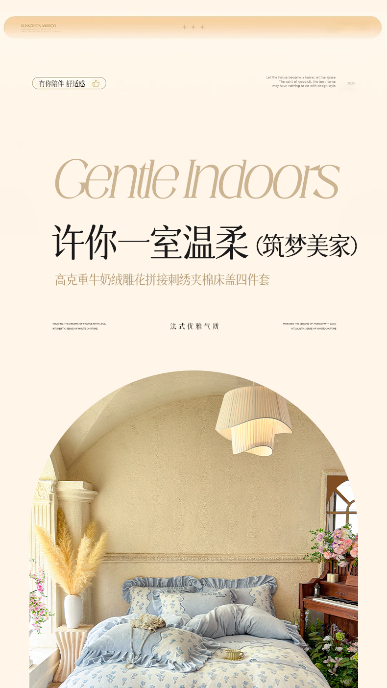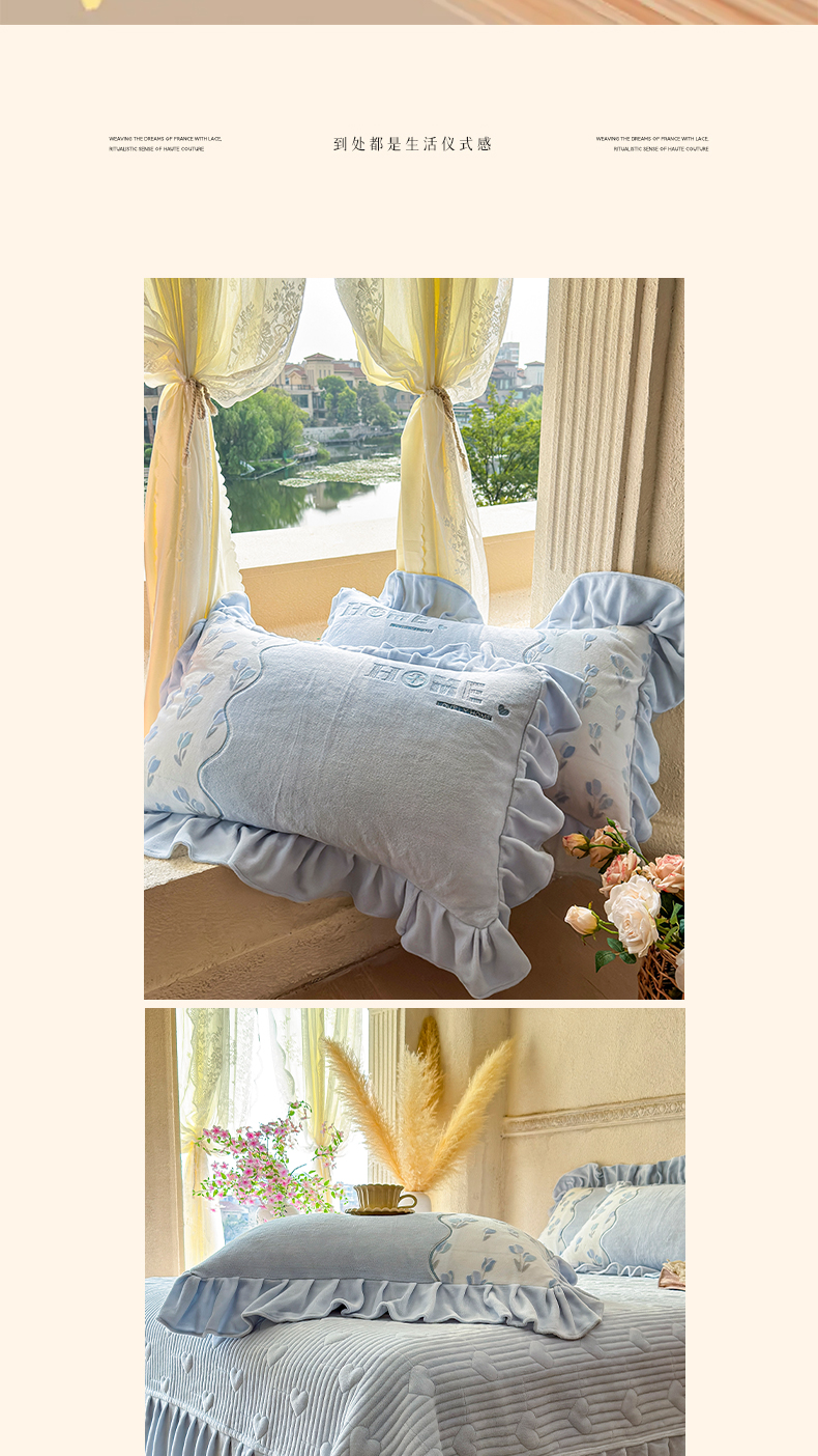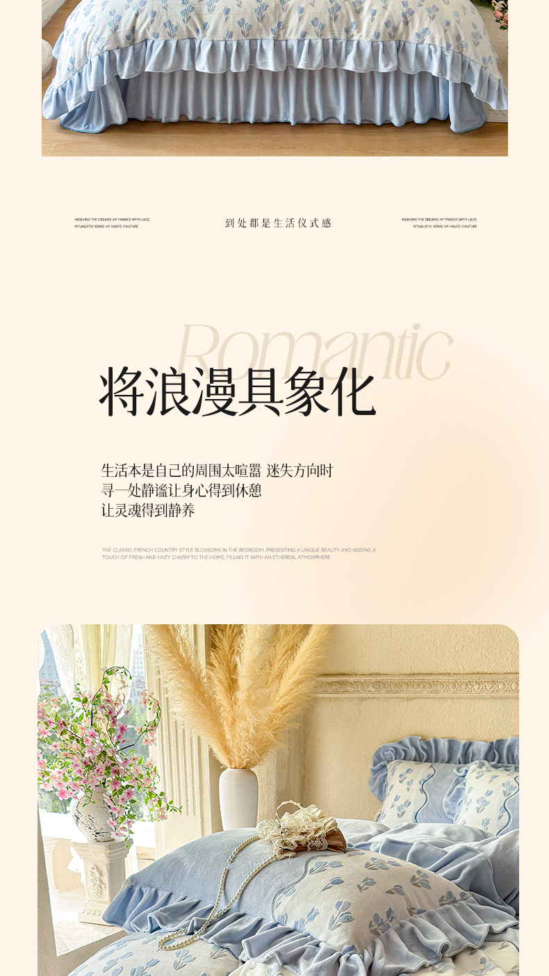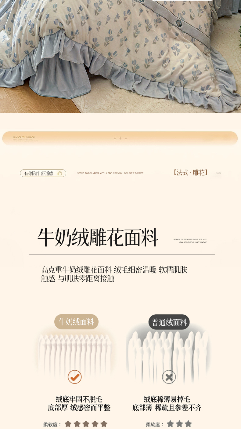 商品名称:宜凡家纺 2025新款牛奶绒雕花拼接刺绣床盖四件套 雾蓝漫织