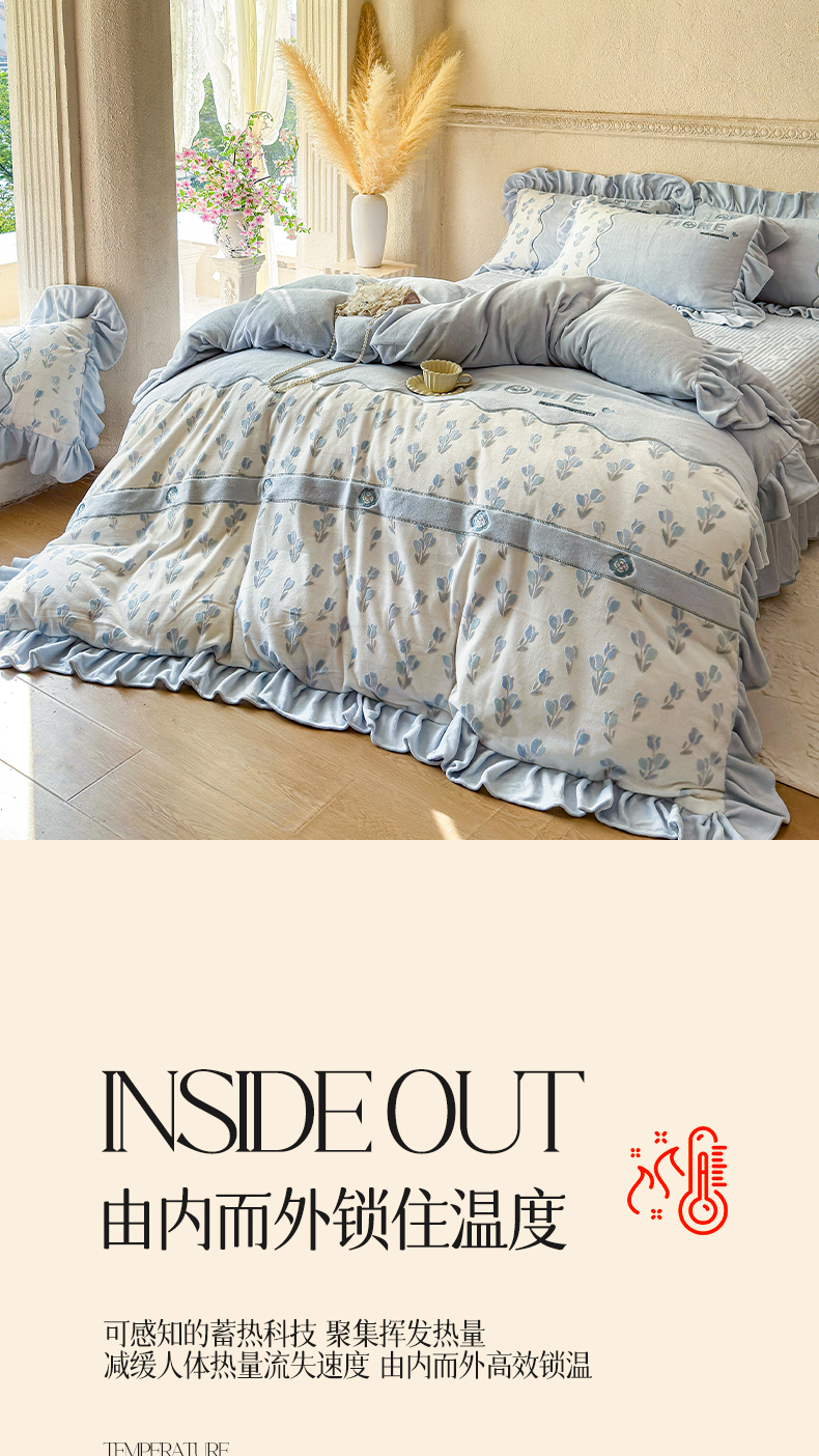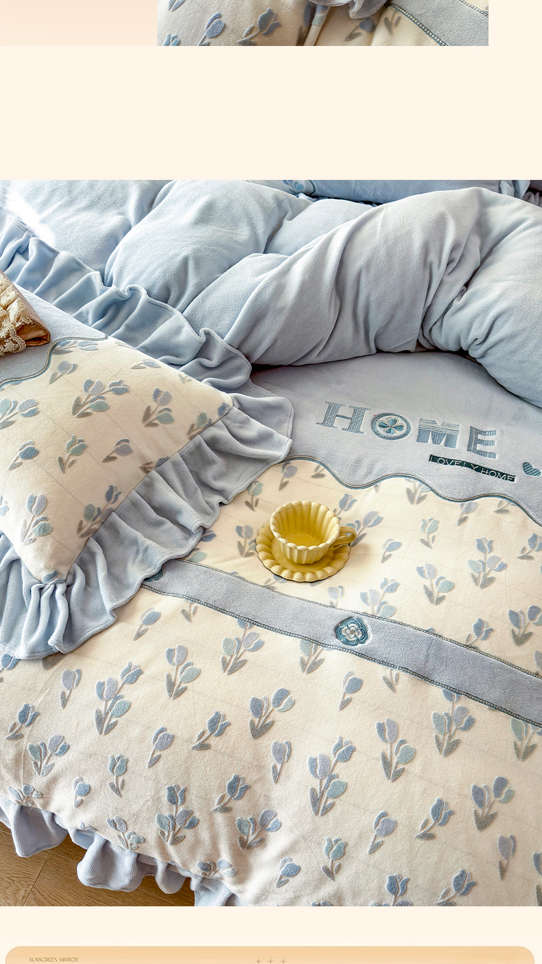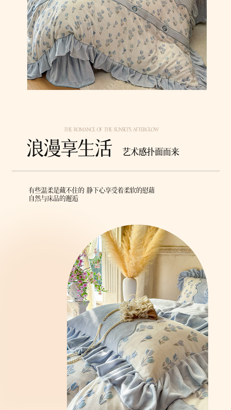 宜凡家纺 2025新款牛奶绒雕花拼接刺绣床盖四件套 雾蓝漫织