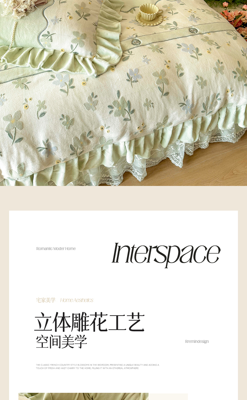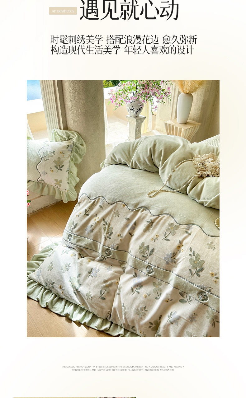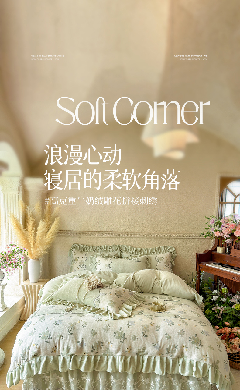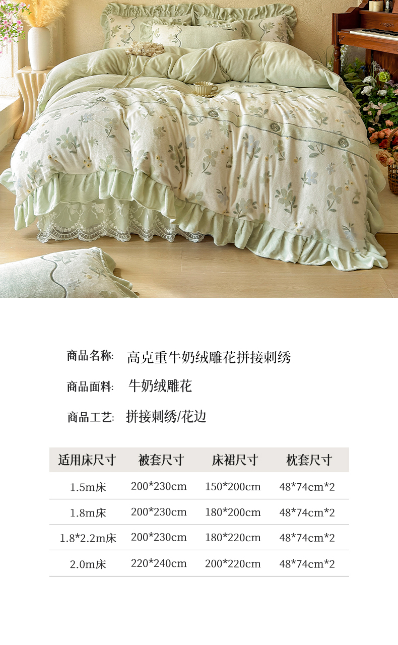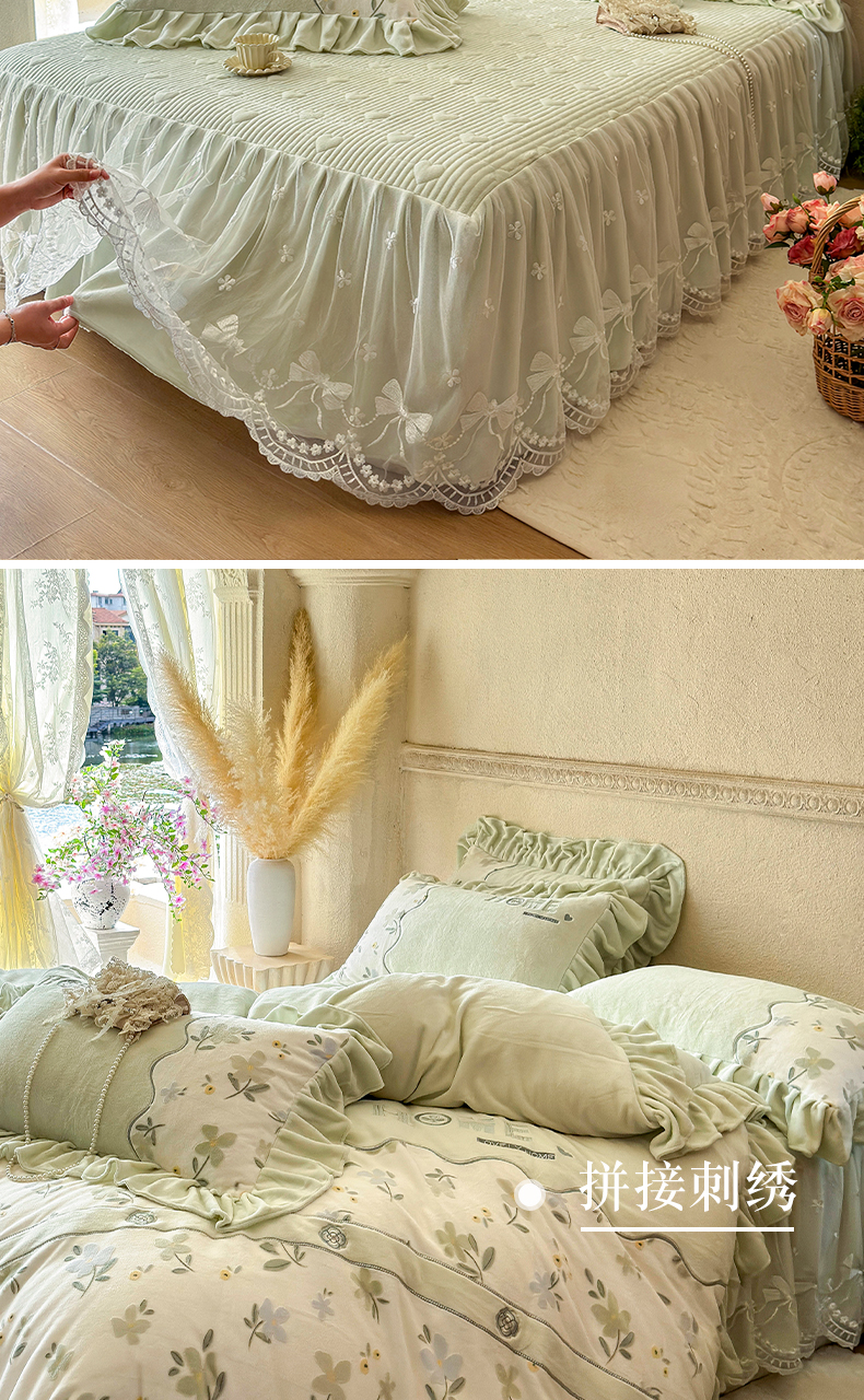商品名称:宜凡家纺 2025新款牛奶绒雕花拼接刺绣床裙四件套 香槟漫月