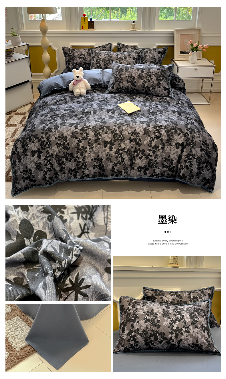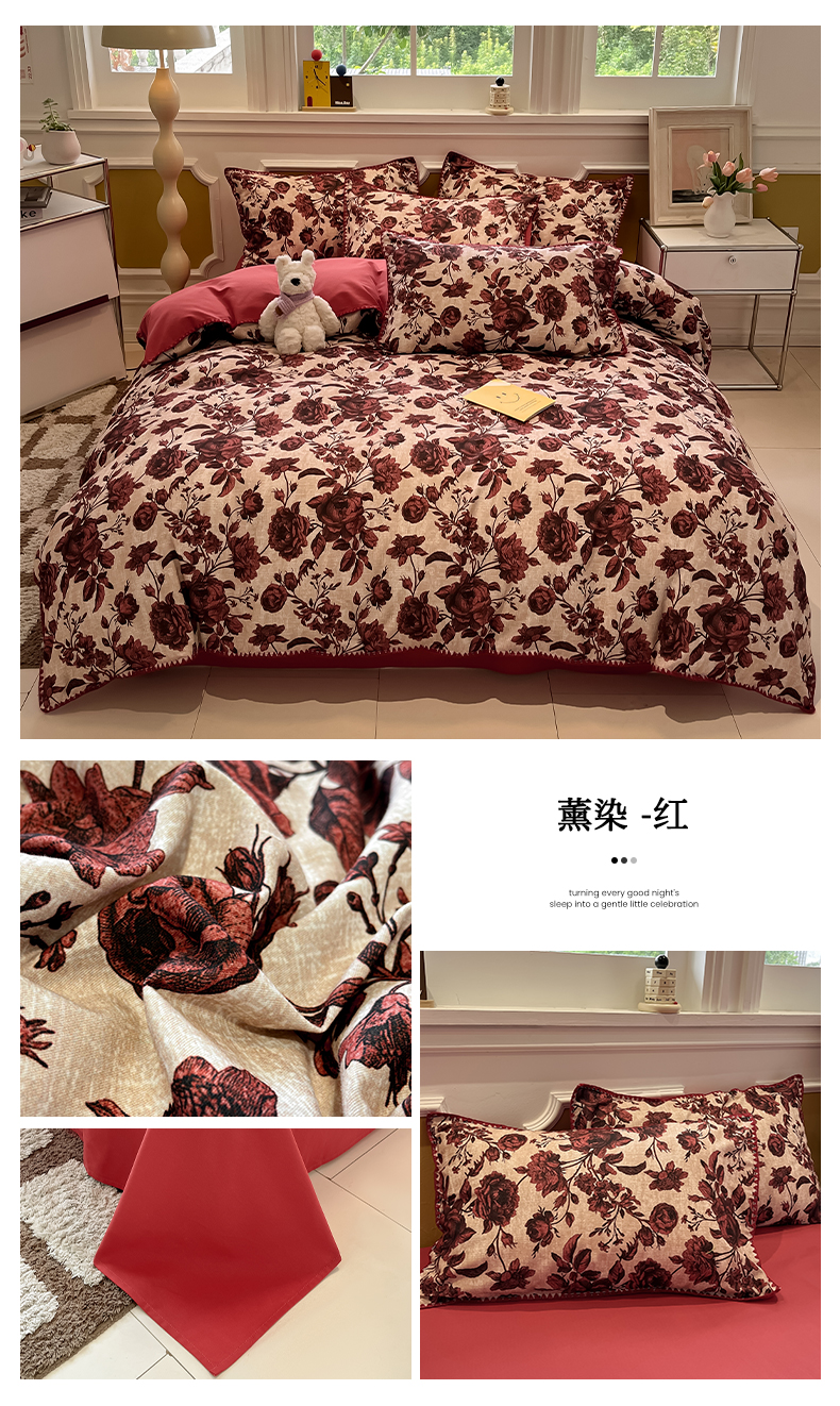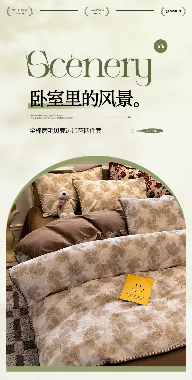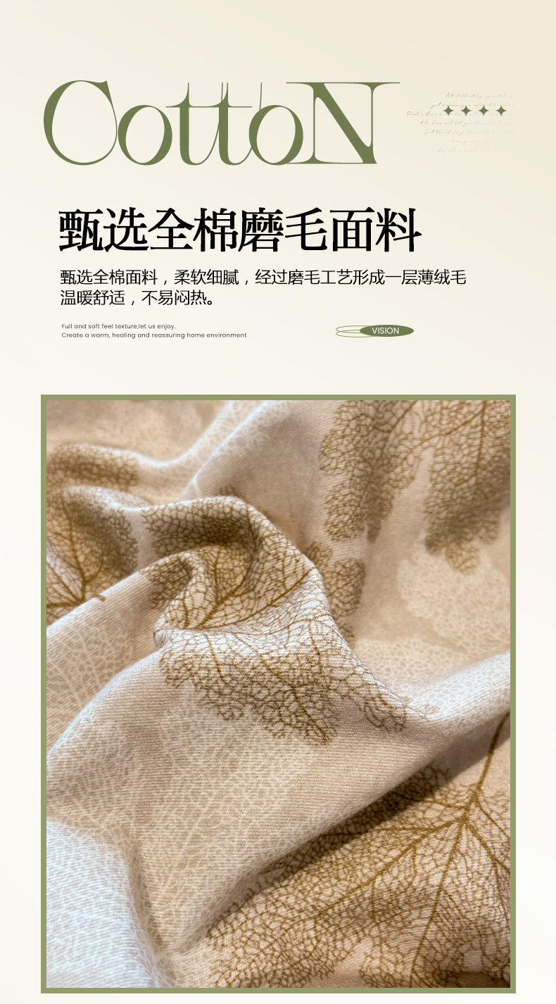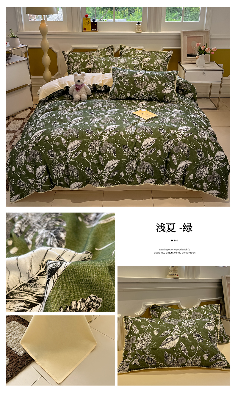 (总)吉象家纺 2025新款全棉磨毛三角针贝壳边印花四件套,枫叶,满园花开 -桔,墨染,浅夏 -绿,清浅,薰染 -红