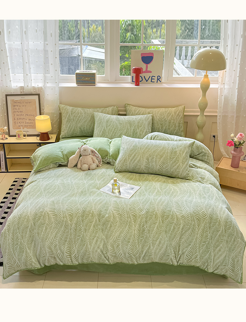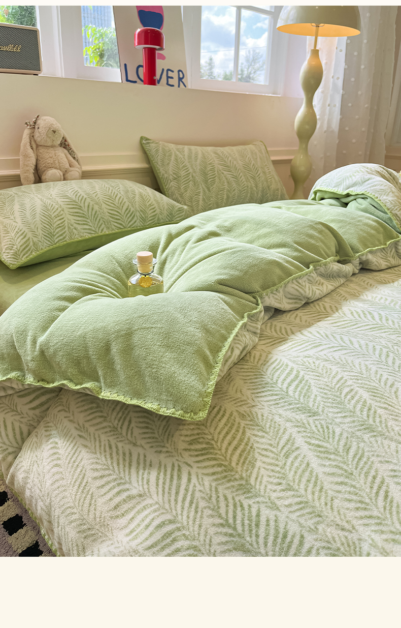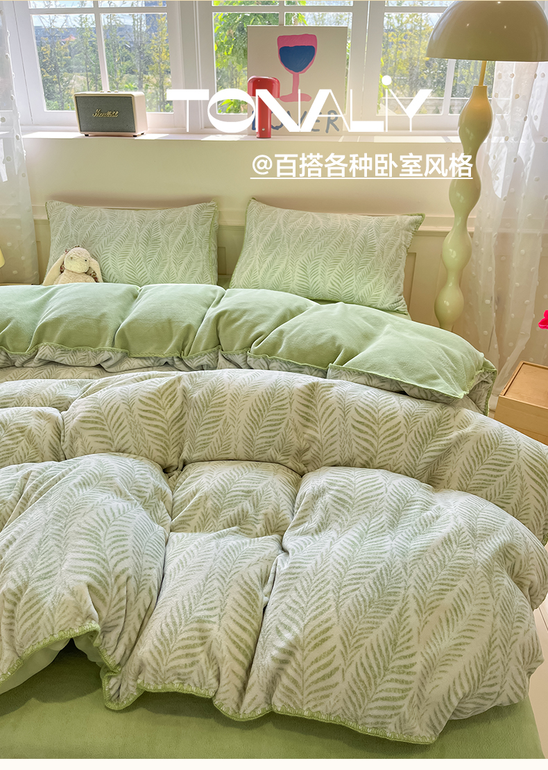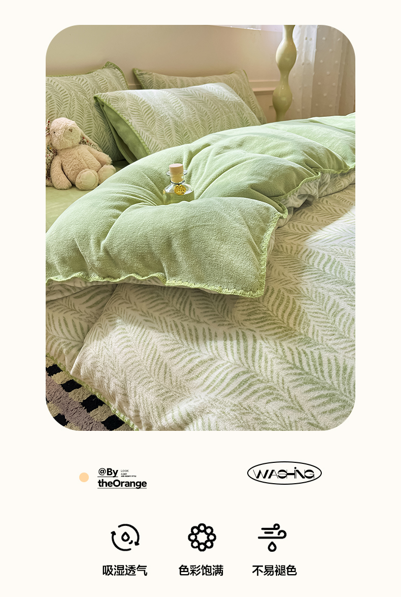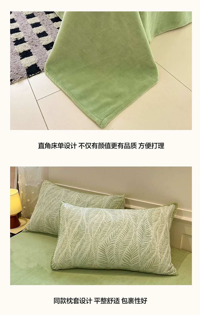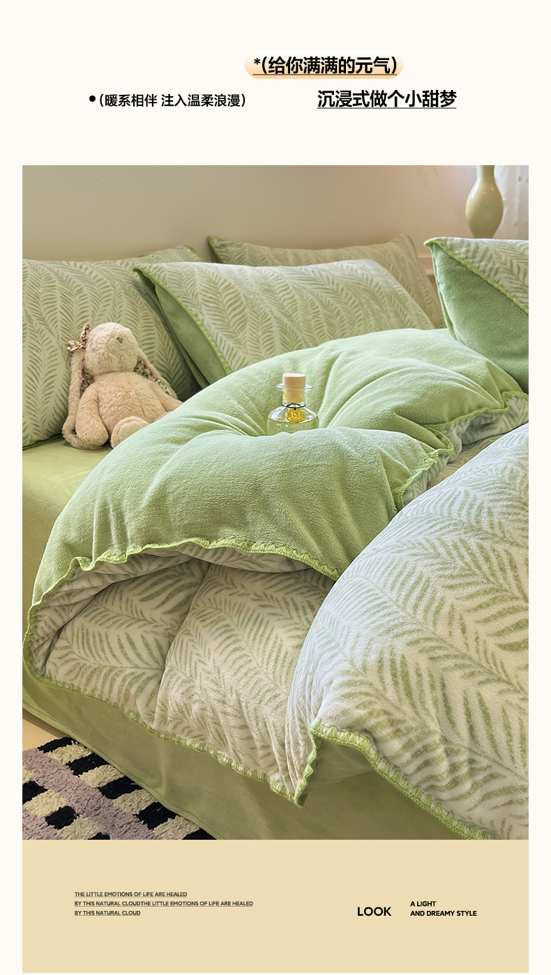 商品名称:如一 2025新款A类高克重牛奶绒印花三角针工艺四件套 流年绿