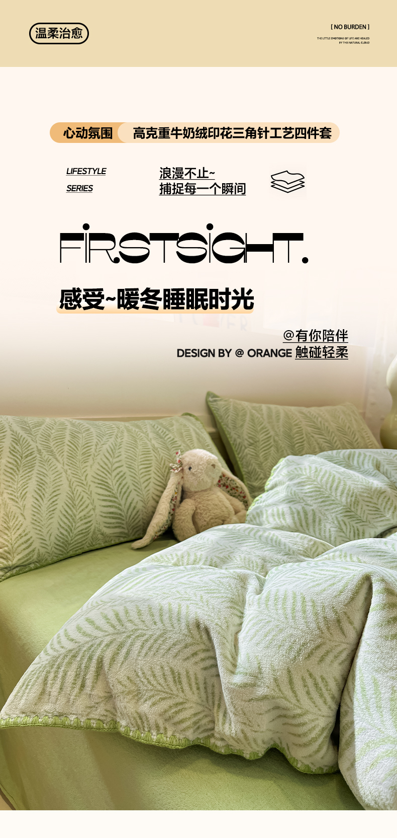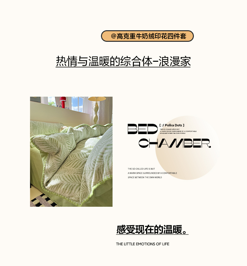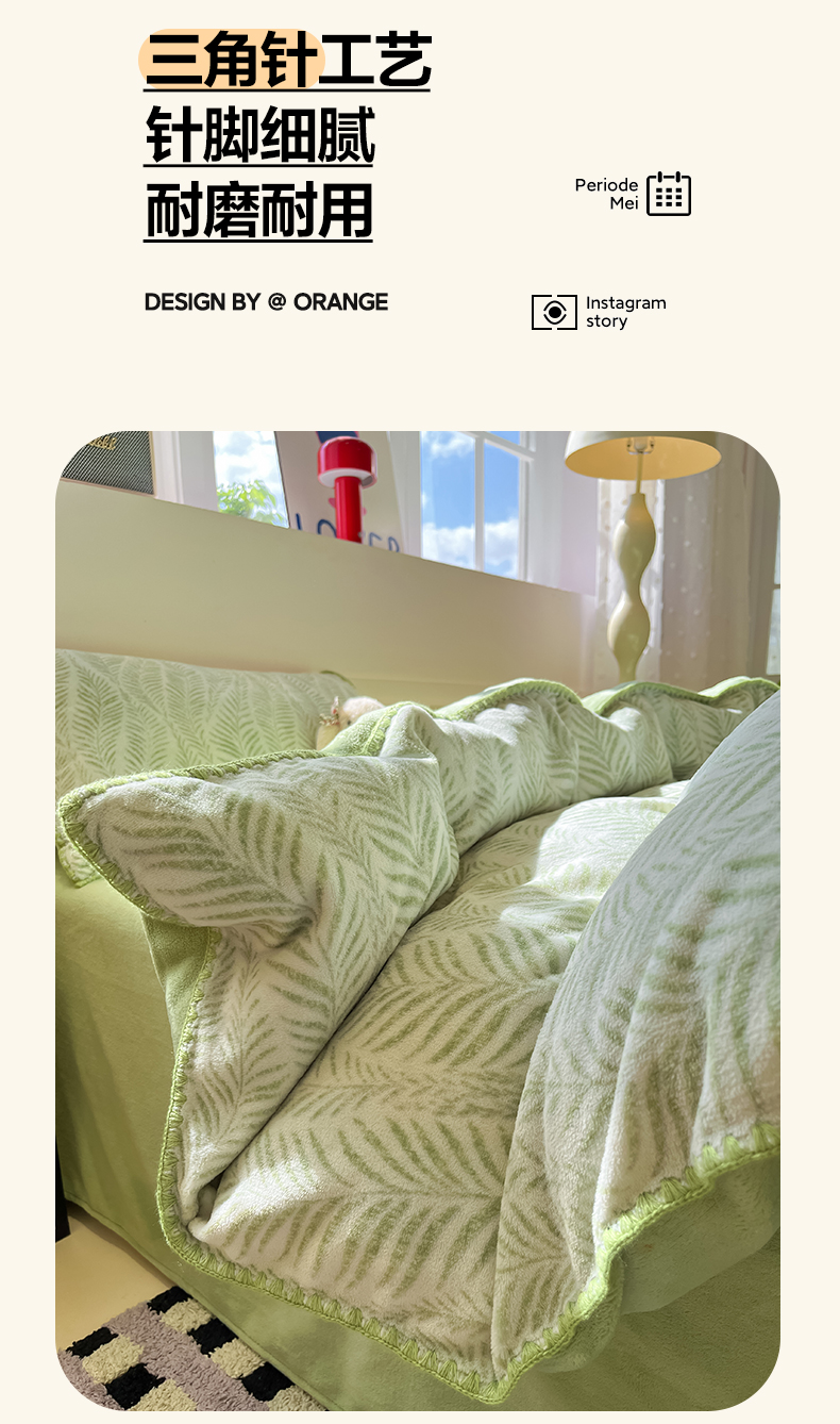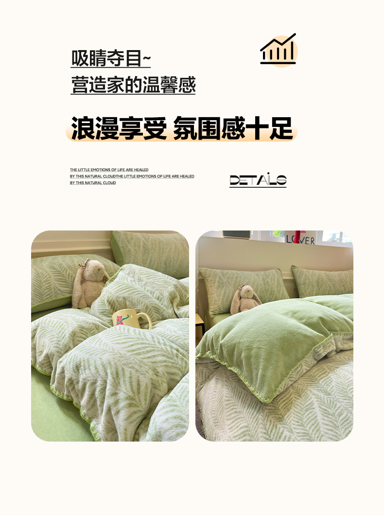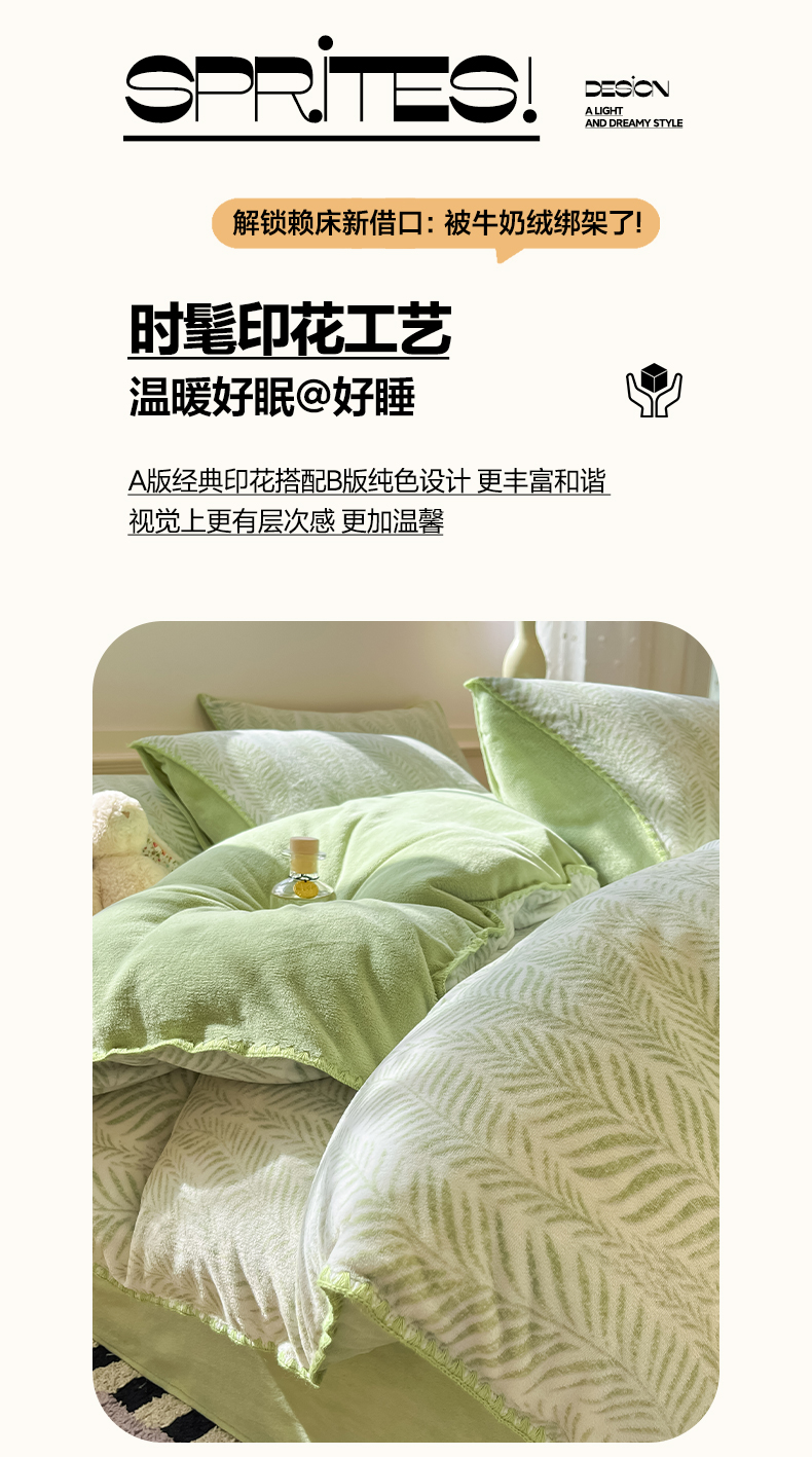 商品名称:如一 2025新款A类高克重牛奶绒印花三角针工艺四件套 流年绿