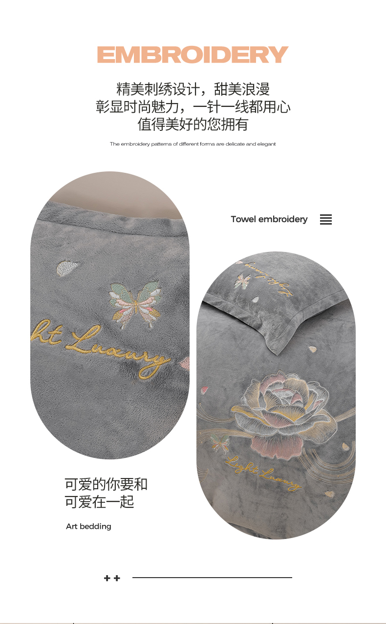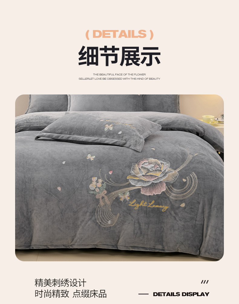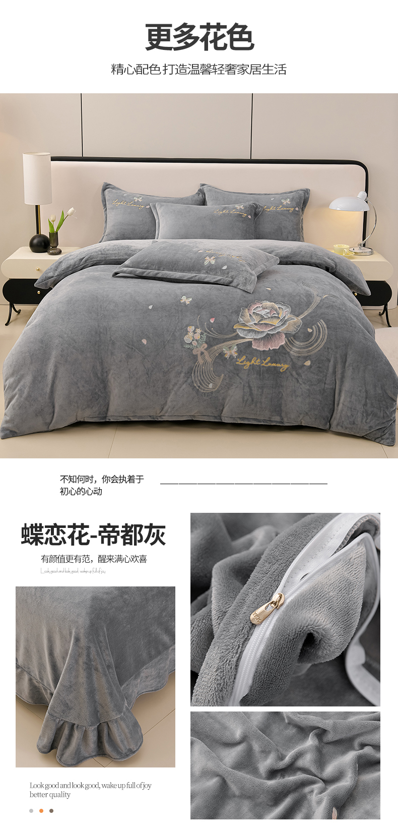 商品名称:绒小宣 2025新款A类牛奶绒刺绣四件套-蝶恋花 帝都灰