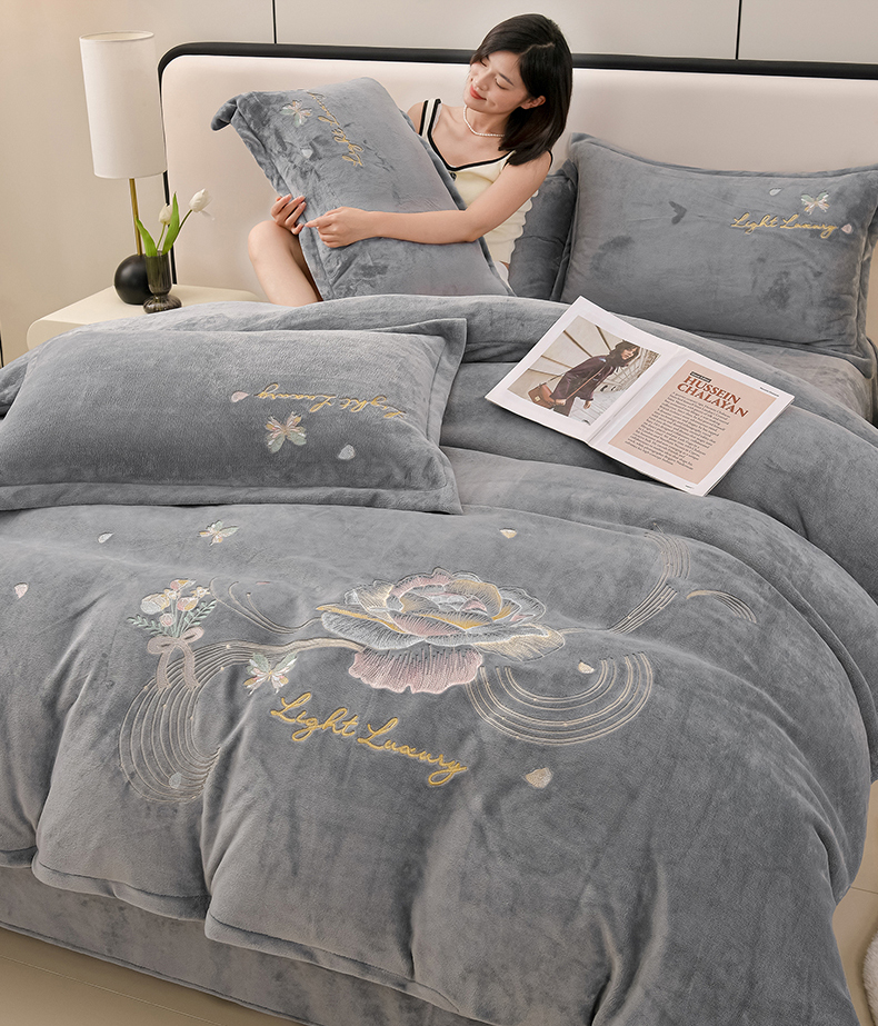 绒小宣 2025新款A类牛奶绒刺绣四件套-蝶恋花 帝都灰