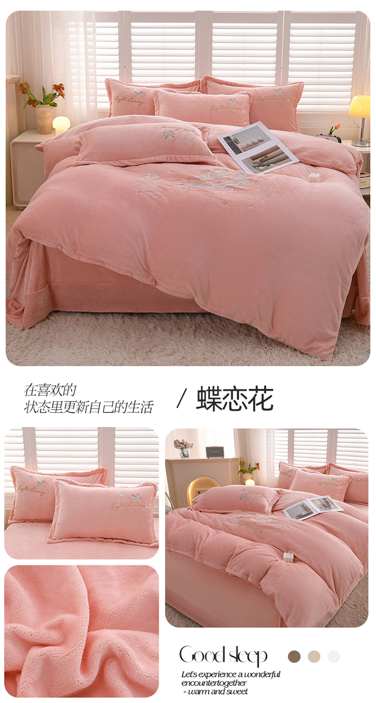 绒小宣 2025新款高克重牛奶绒刺绣四件套 蝶恋花粉,蝶恋花-粉