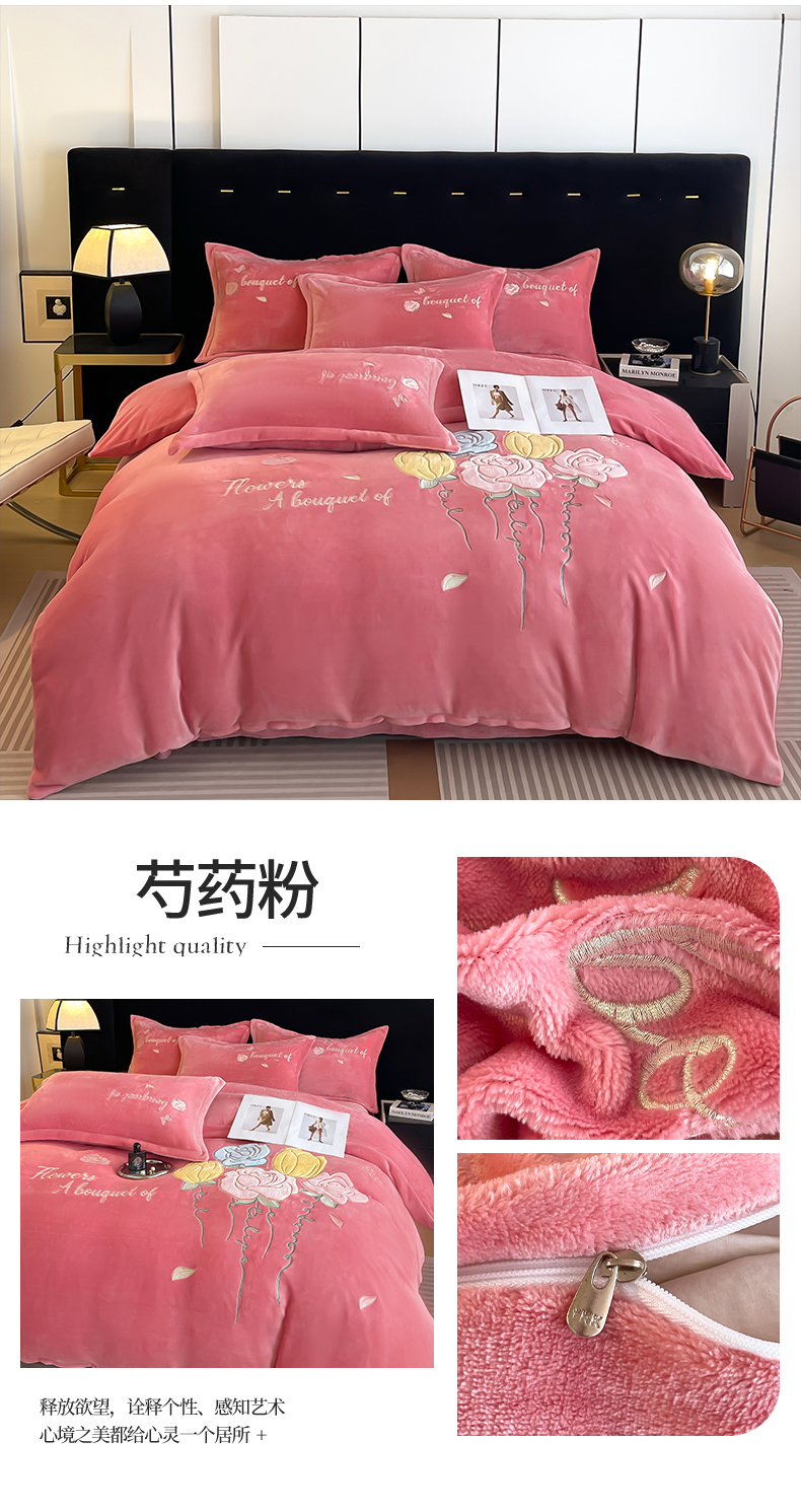 绒小宣 2025新款高克重牛奶绒刺绣四件套 花开富贵-粉,花开富贵-粉