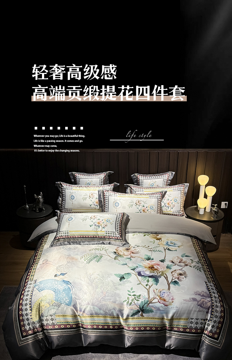 (总)七夜居 2025新款欧式轻奢高精密色织贡缎提花四件套礼盒装,一曲,繁茂,飞绒落羽,幻境,莫离,踏山河,波尔塔,长相思,莱肯,摩登都市,海蓝之心,锦绣年华,牡丹盛世,牡丹之歌,一叶知秋
