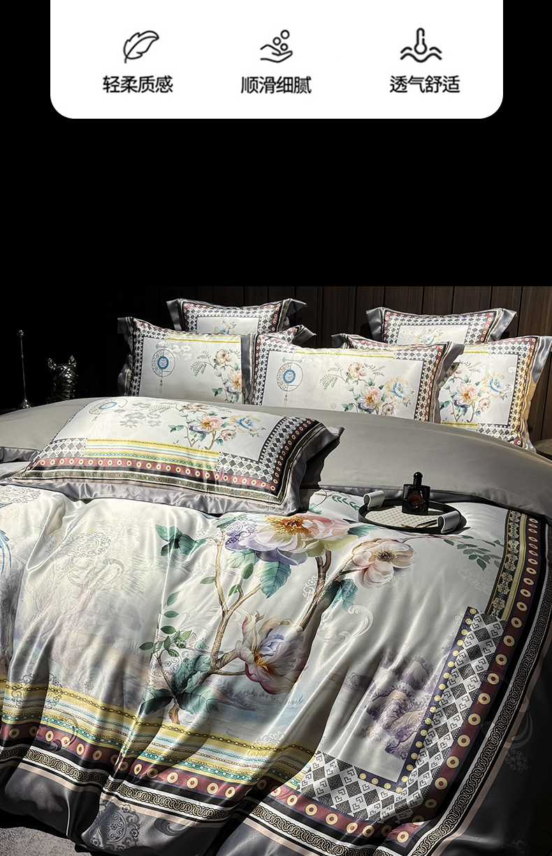 七夜居 2025新款直播爆款欧式大阪轻奢贡缎提花加数码印花磨毛四件套 牡丹亭-霜灰