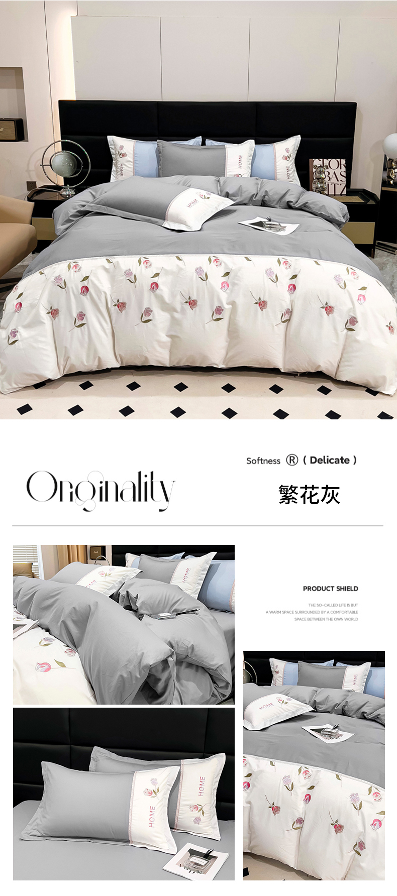 (总)优姿家纺 2026新款全棉拼接绣花四件套,繁花粉,繁花灰,繁花桔,繁花蓝,繁花绿,繁花紫