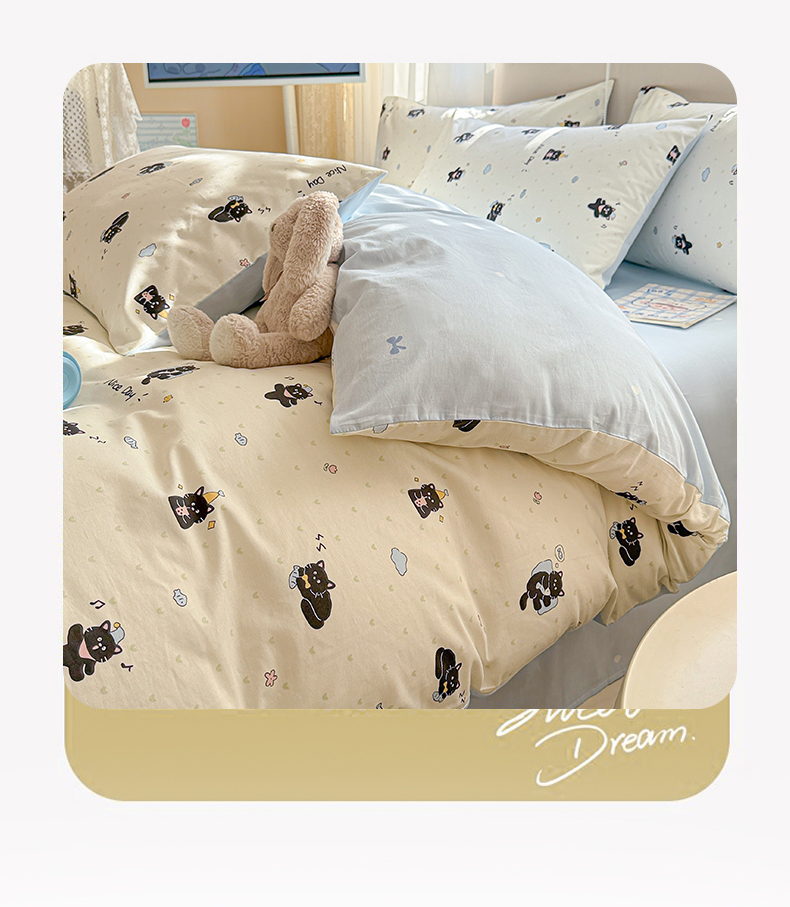 (总)曼之夏 2025新款全棉纯棉40支学生季卡通印花四件套,椰蓝小腊肠,茶茶狗,格子猫,嗨皮狗,开心屋,可爱多,可可汪,玛奇朵,奶昔小熊,泡芙小象,曲奇小狗,趣味熊,甜甜圈,甜心猫咪,童画,小狗日记,樱桃熊仔
