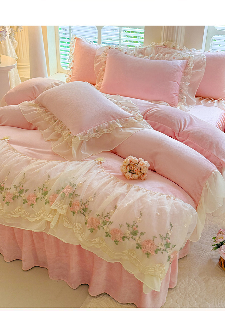 (总)苏米娜家纺SUMINA 2025新款230g高克重韩版立体盘花牛奶蚕丝绒绣花四件套床裙款被套-洛丽塔系列,洛丽塔-嫩黄 ,洛丽塔-香芋紫,洛丽塔-珍珠粉, 洛丽塔-婴儿蓝