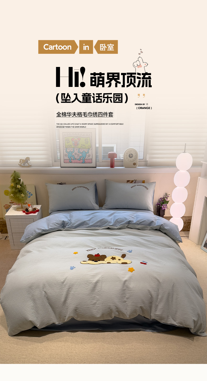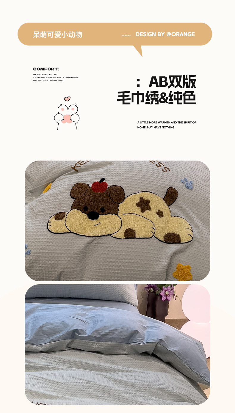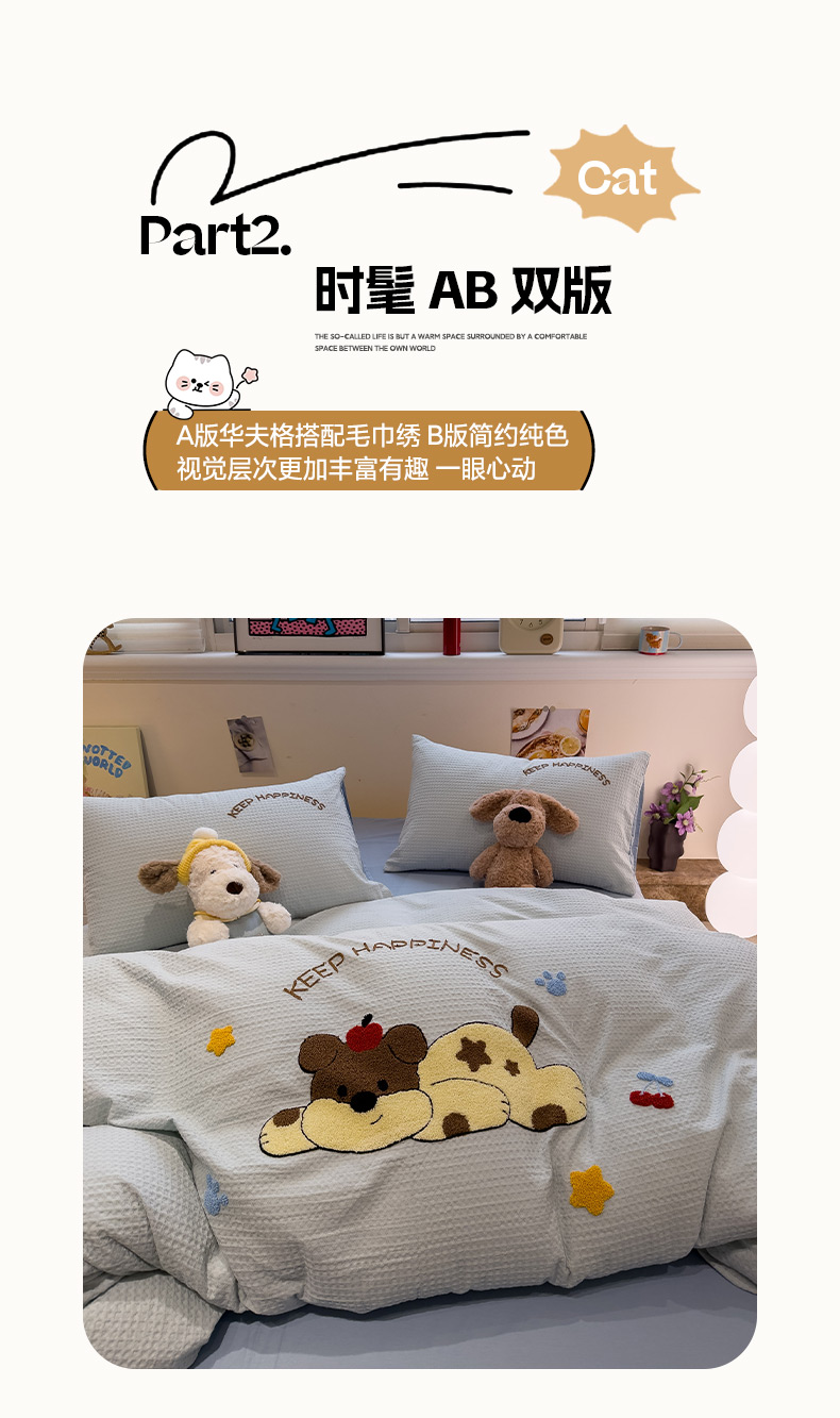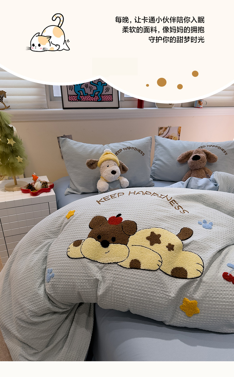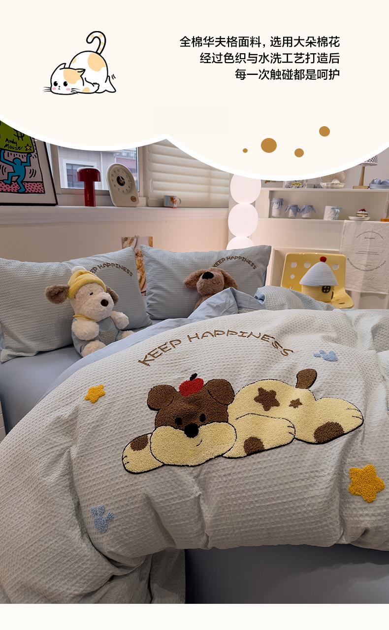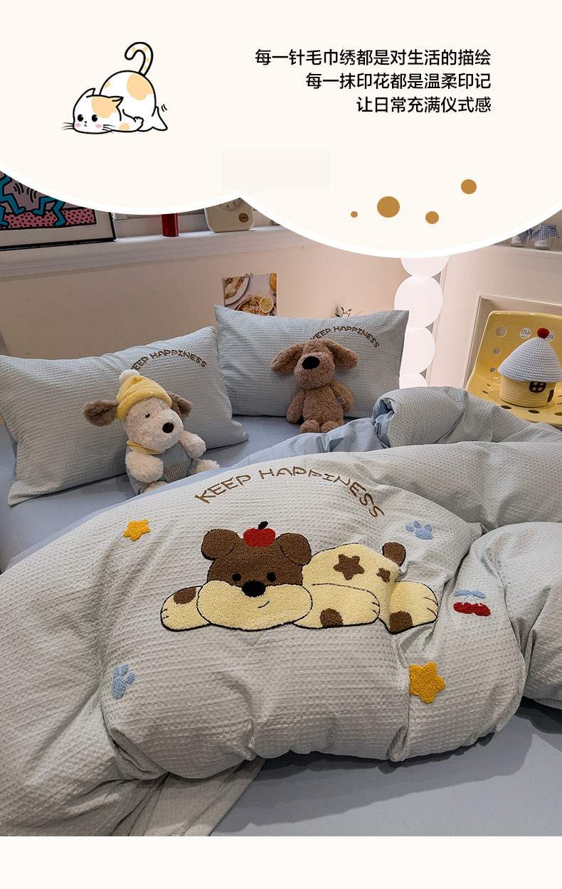 当前位置: 91家纺网 > 商品网购 > 床品套件 > 四件套 > 全棉普通四件套 > 雅居纺家纺 2026新款全棉华夫格毛巾绣四件套 蓝色趴趴狗