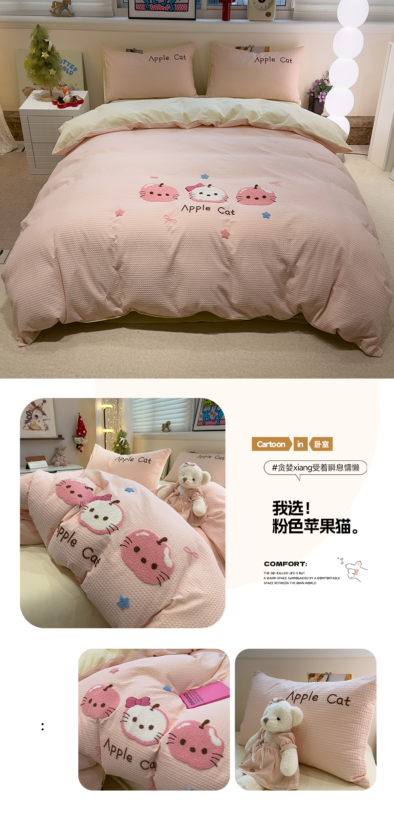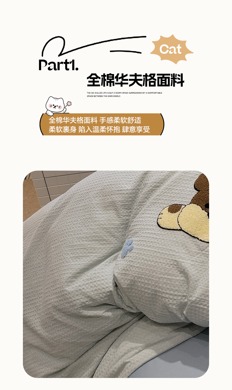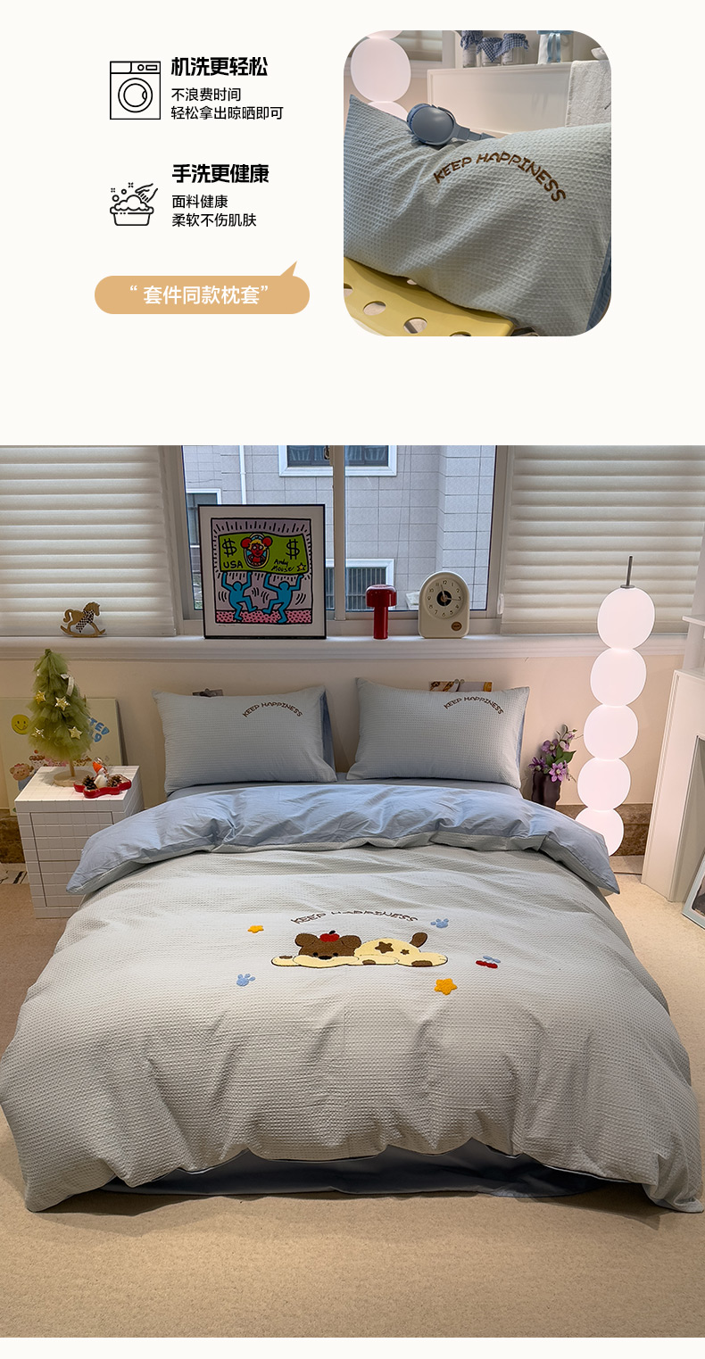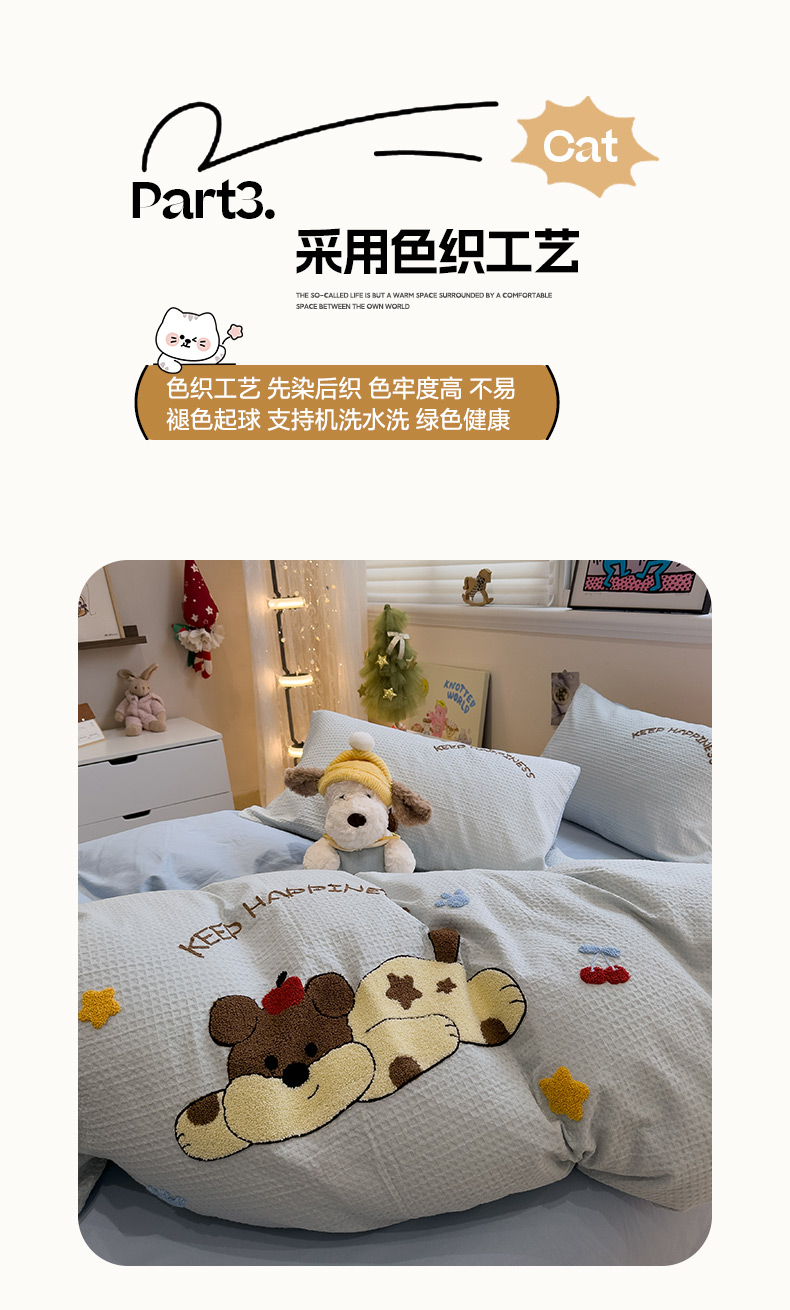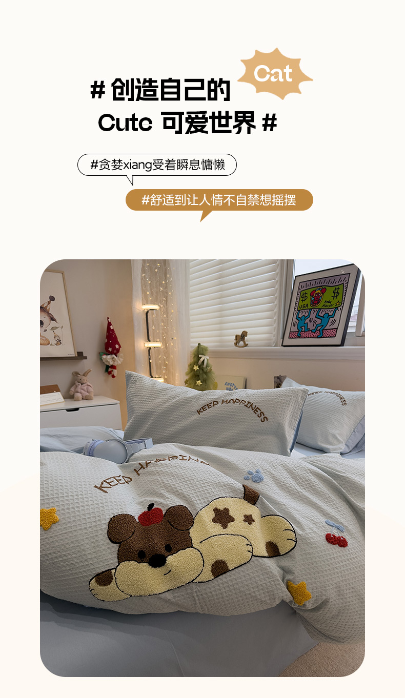 当前位置: 91家纺网 > 商品网购 > 床品套件 > 四件套 > 全棉普通四件套 > 雅居纺家纺 2026新款全棉华夫格毛巾绣四件套 蓝色趴趴狗
