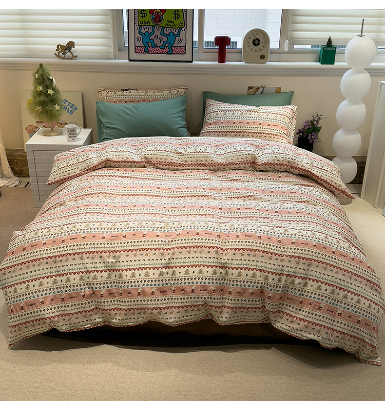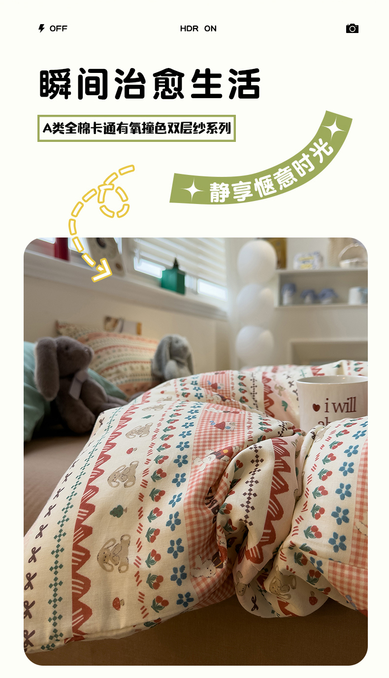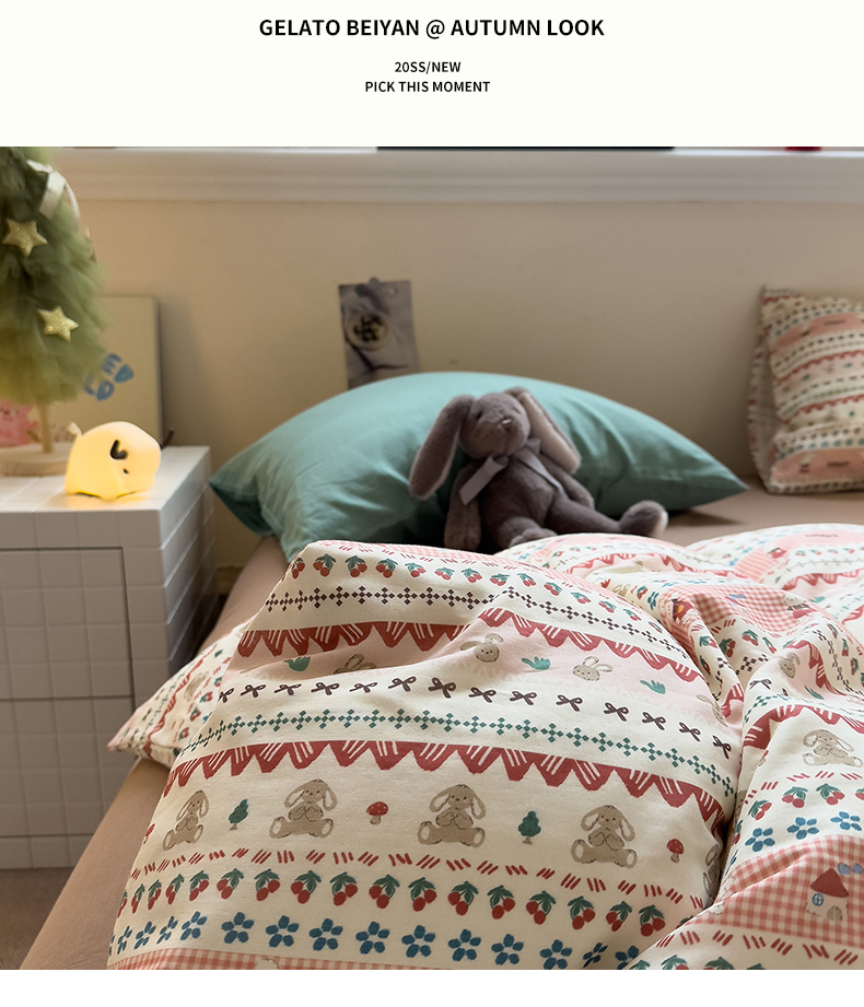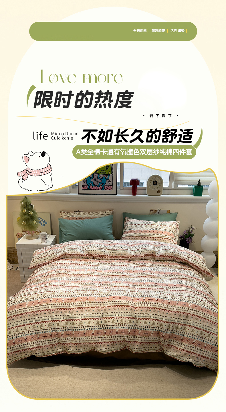 (总)呗旺鹿 2026新款全棉撞色双层纱四件套,双层纱-喜喜兔,双层纱-费尔岛小熊,双层纱-姜饼人,双层纱-魔法兔,双层纱-千禧马,双层纱-雪花小狗,双层纱-萌星