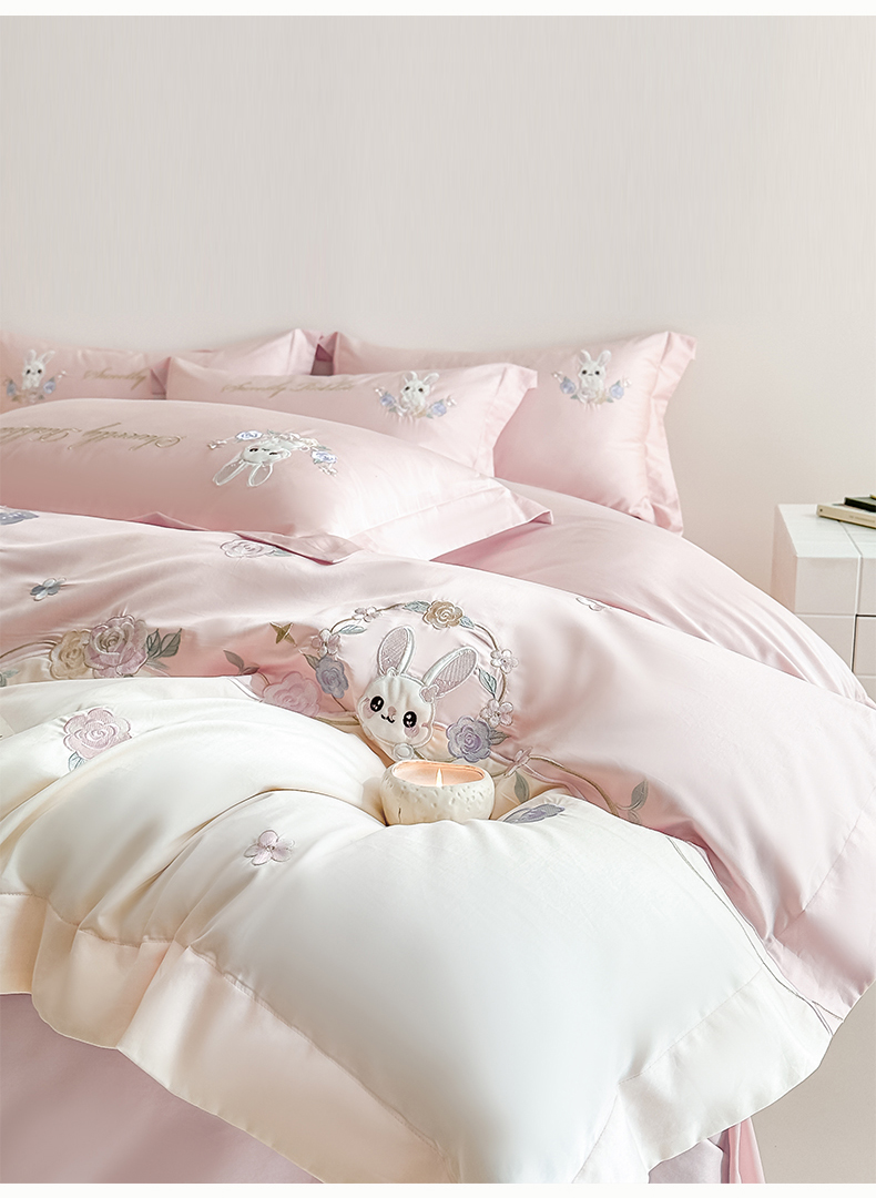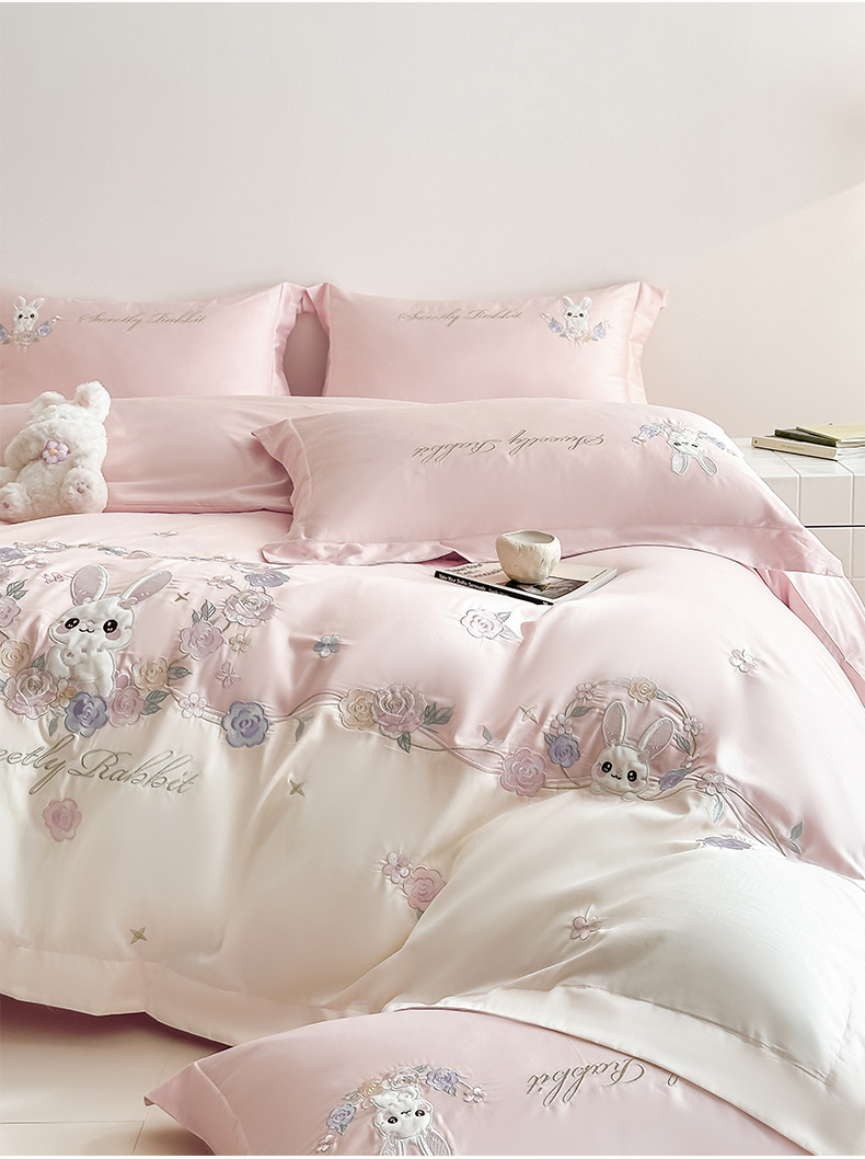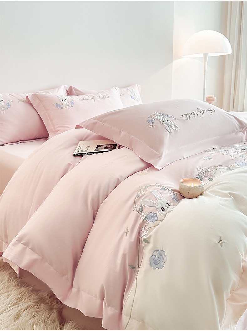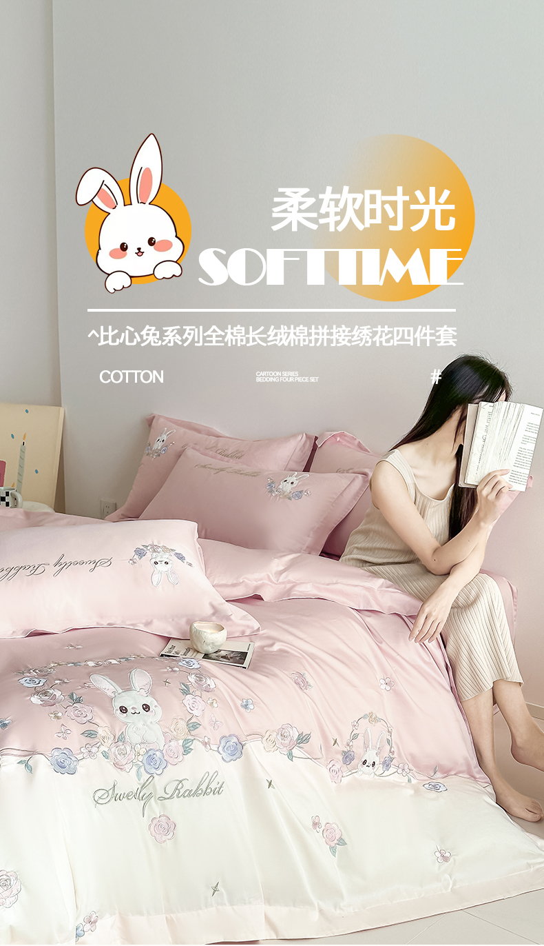 当前位置: 91家纺网 > 商品网购 > 床品套件 > 四件套 > 全棉普通四件套 > (总)置顶家纺 2026新款比心兔系列全棉长绒棉拼接绣花四件套