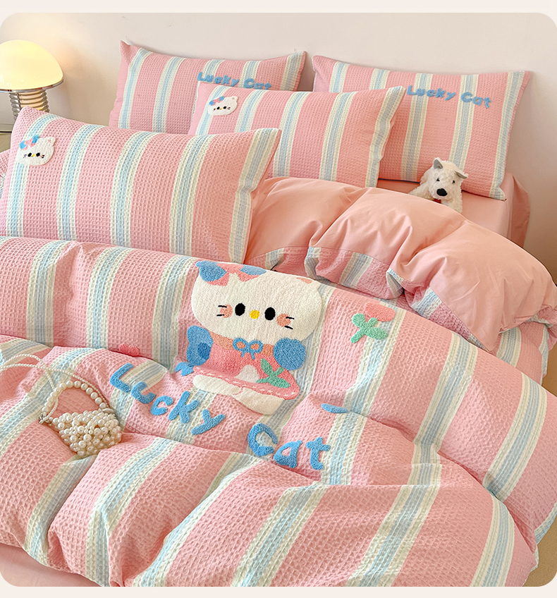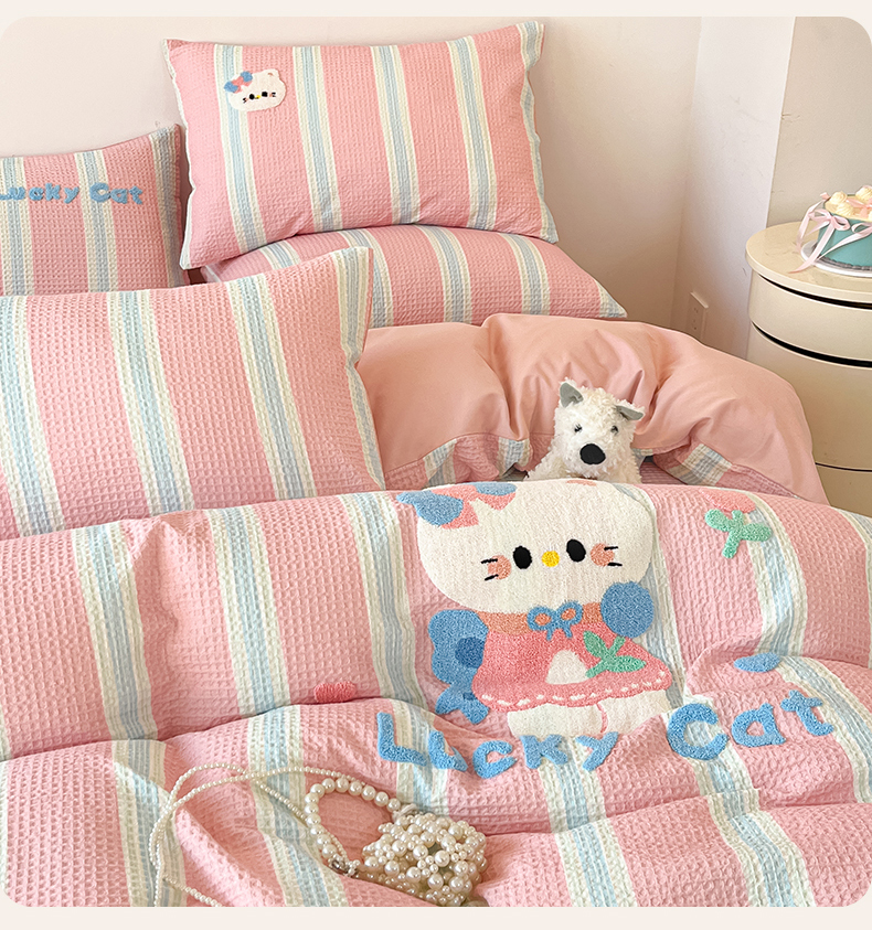 笙意家纺 2026新款全棉A版华夫格B版40支毛巾绣四件套 咪咪小猫