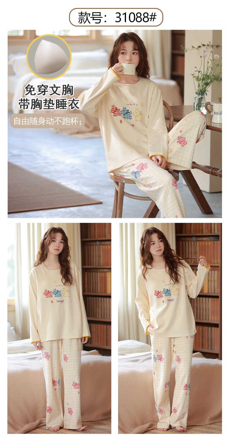 (总)洛兰沙家居馆 2026春季新款自带胸垫纯棉居家睡衣女长袖套头可爱家居服套装 第二批,31086,31087,31088,31089