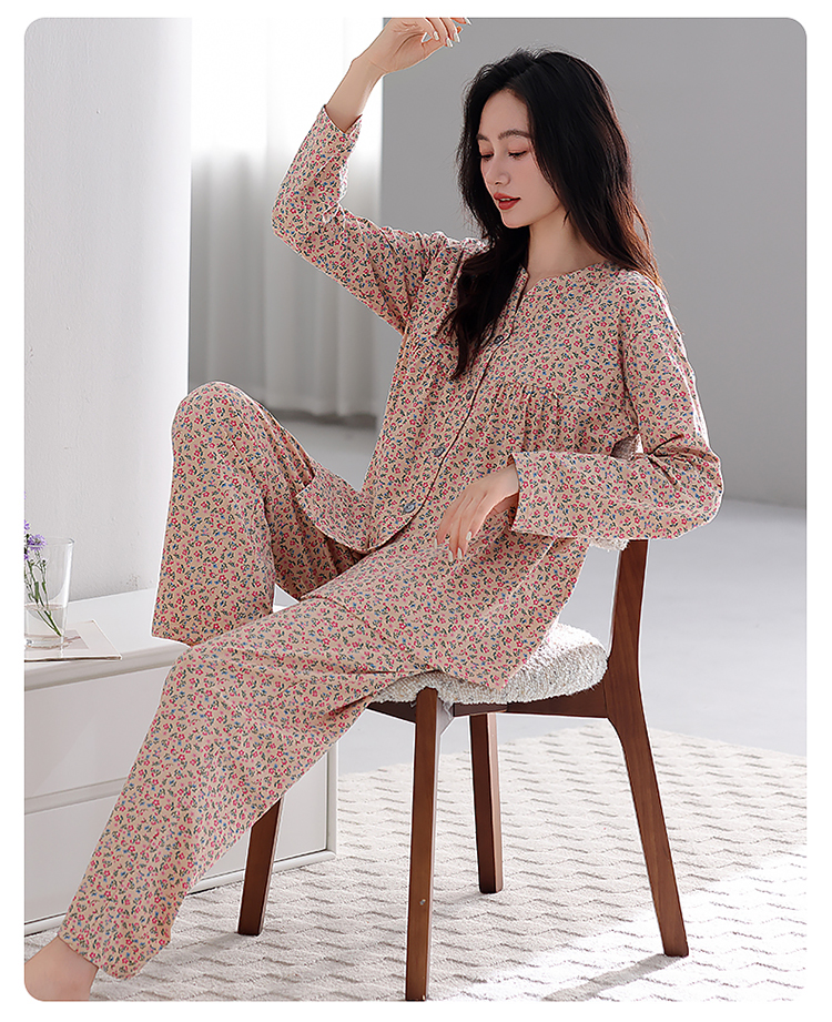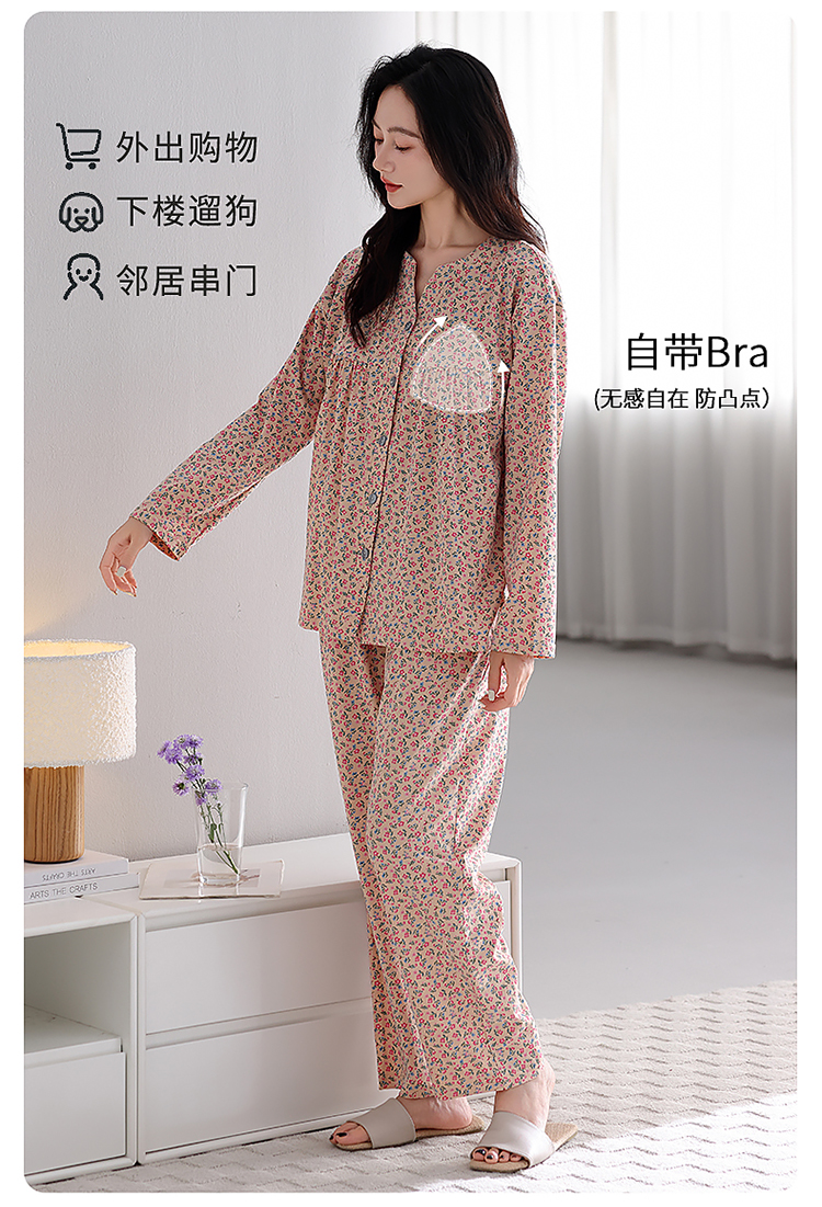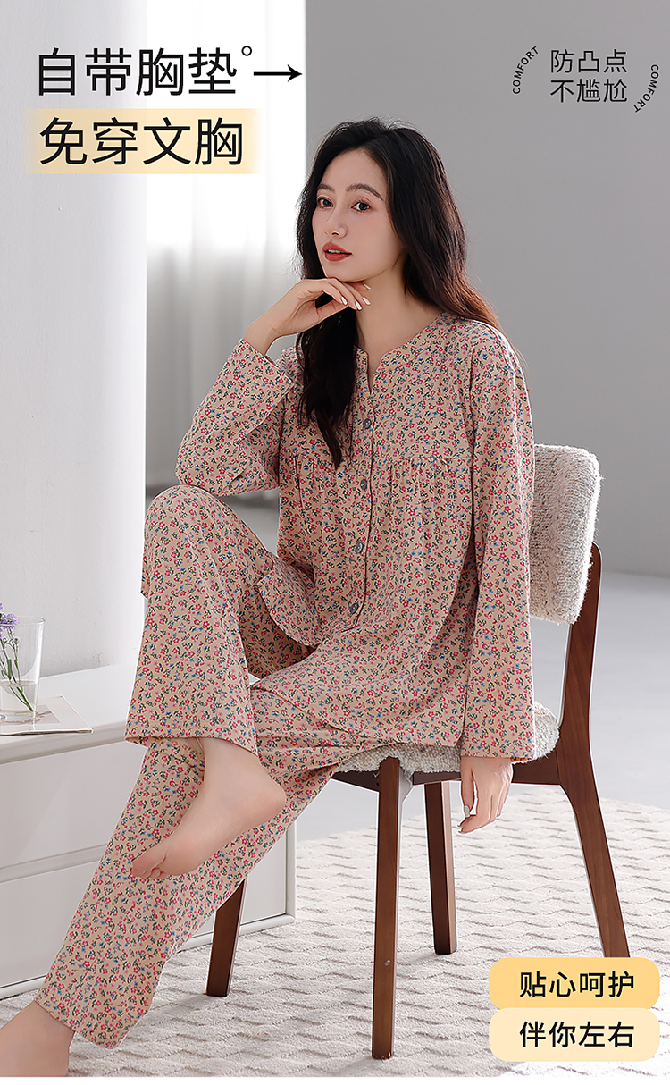 洛兰沙家居馆 2026新款秋冬睡衣女拉架棉带胸垫可外穿长袖长裤青中年女士家居服套装第12批 5907