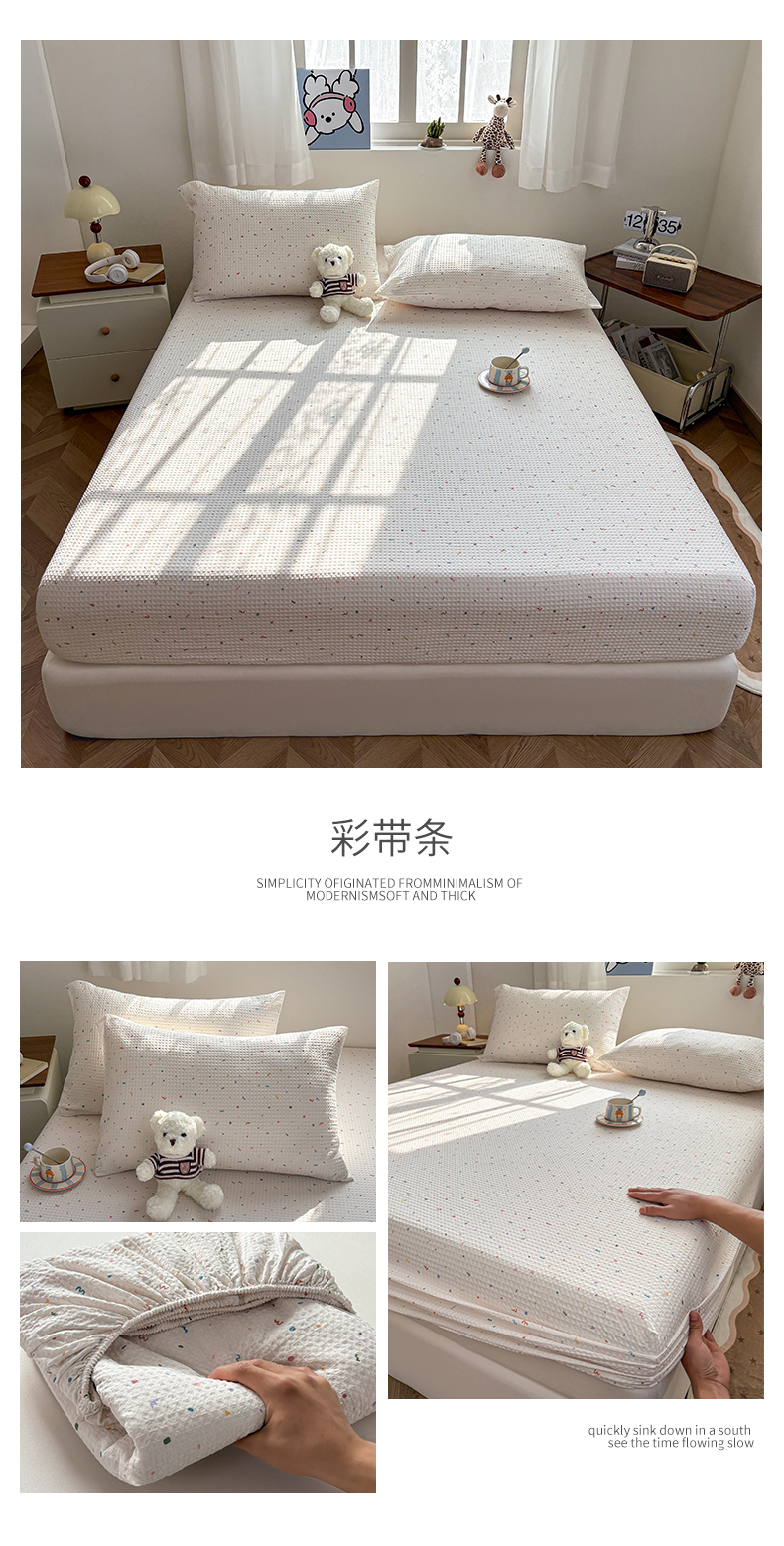 (总)居眠 2026新款全棉印花华夫格床笠,彩带条,花眠,条纹粉,细灰条,小斑点,小樱桃,樱桃小象,月亮星星,组合叠拍图