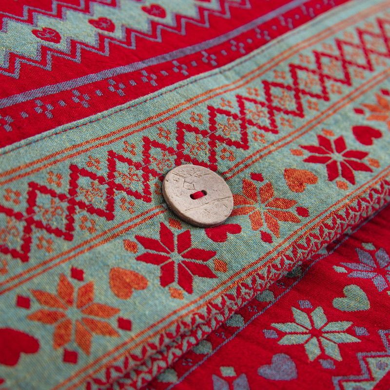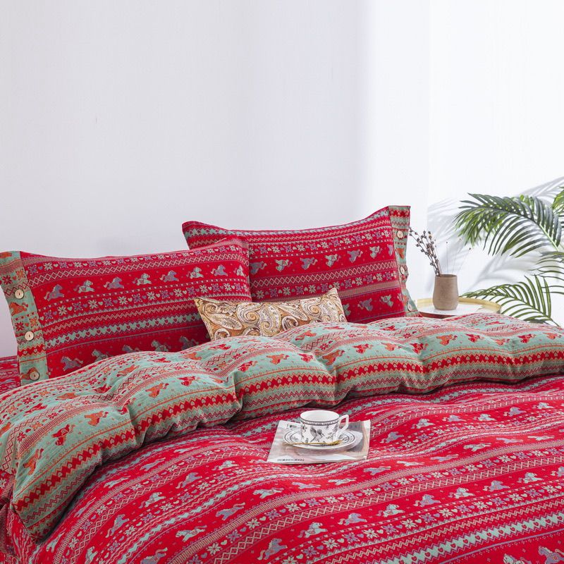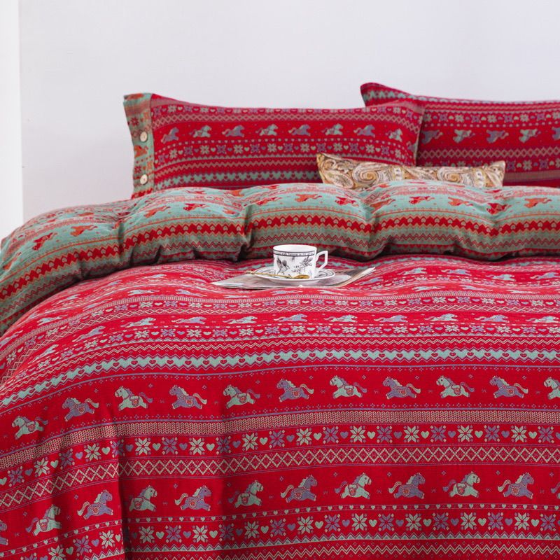(总)双层纱家居 2026新款全棉纯棉色织提花拼角飞边款四件套-郁金花园正红,郁金花园正红