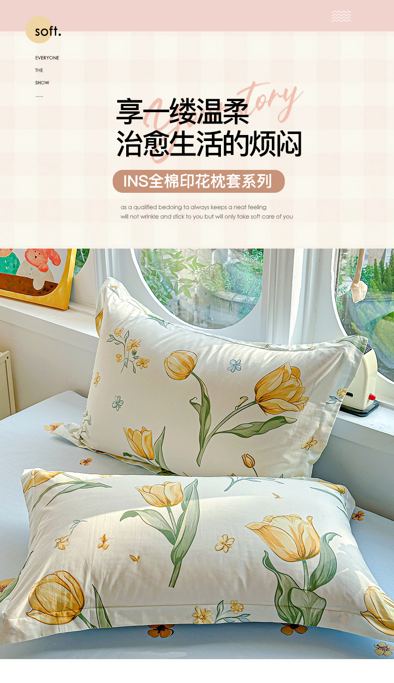 恩泽家纺 2026新款13372ins全棉印花四件套单品系列-单枕套 沐浴暖阳