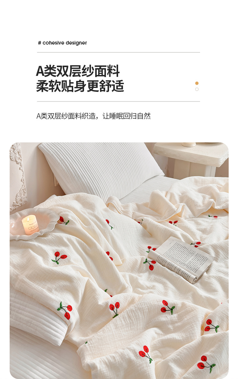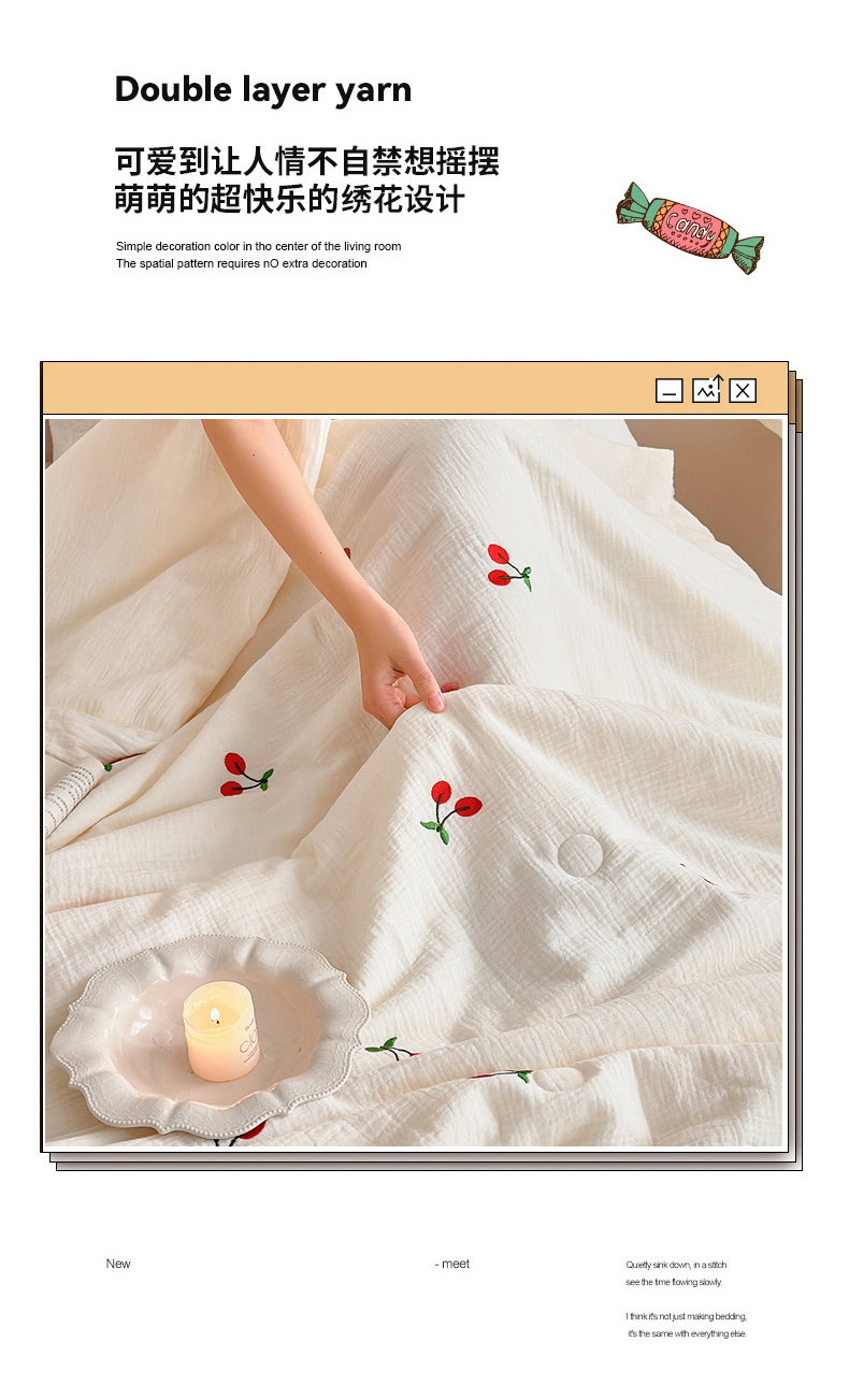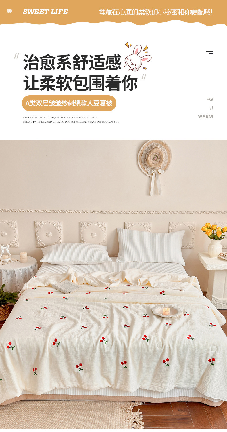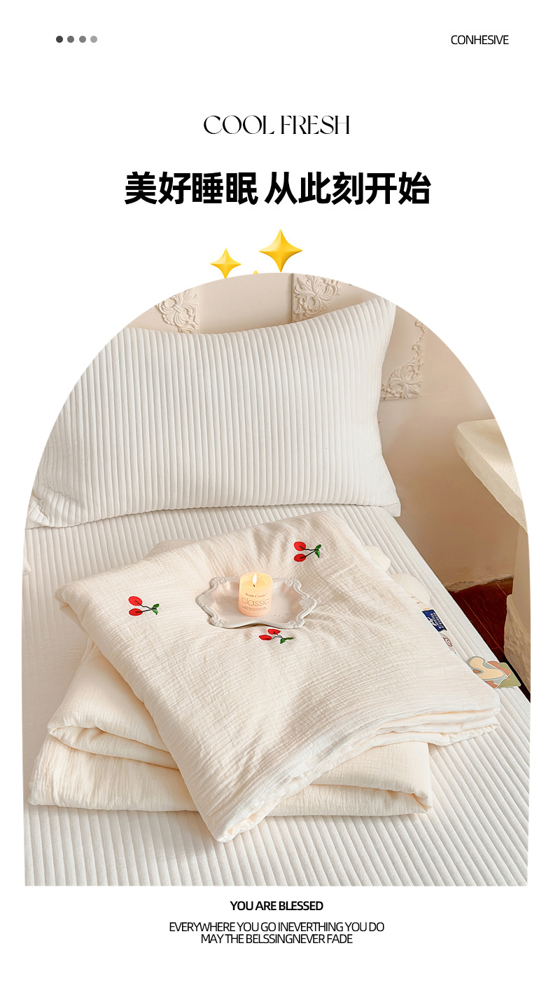 • 91家纺网 家纺一手货源 找家纺 木楌家居 2026新款全棉皱皱纱刺绣款夏被床盖四件套 小樱桃