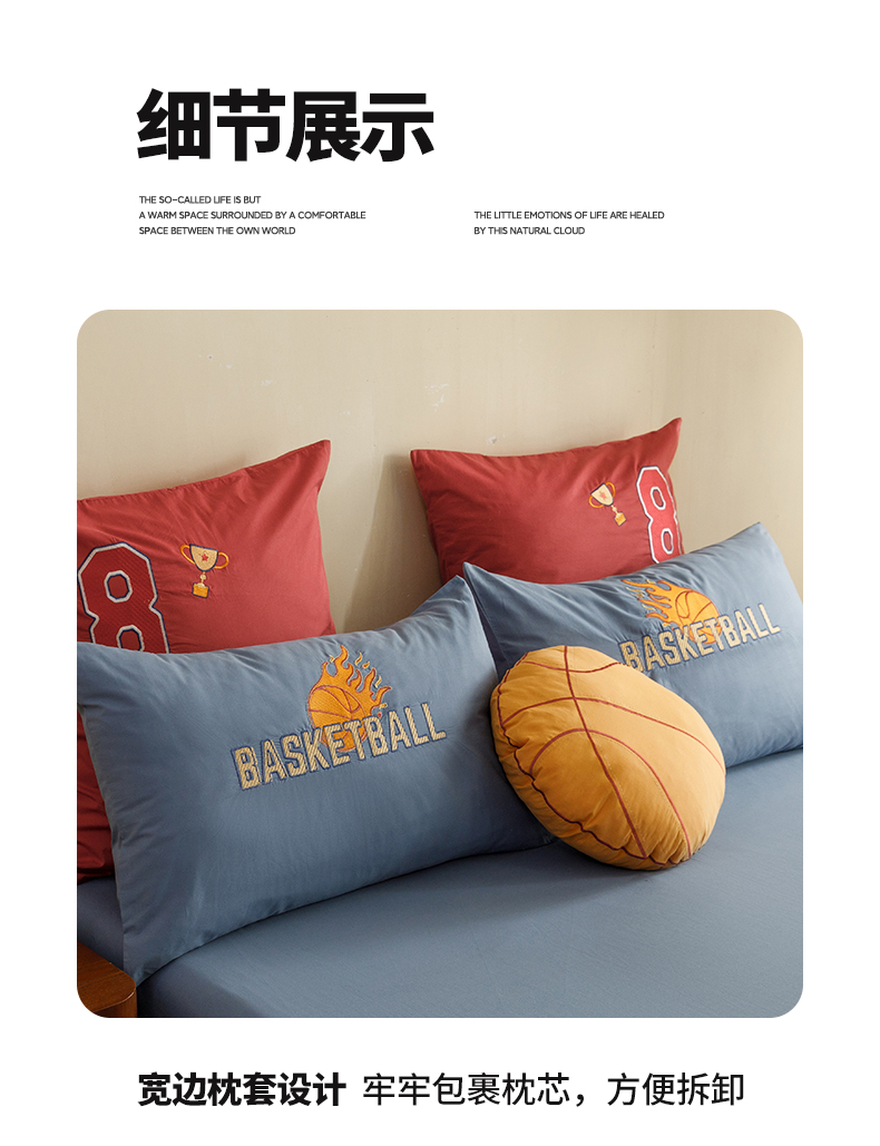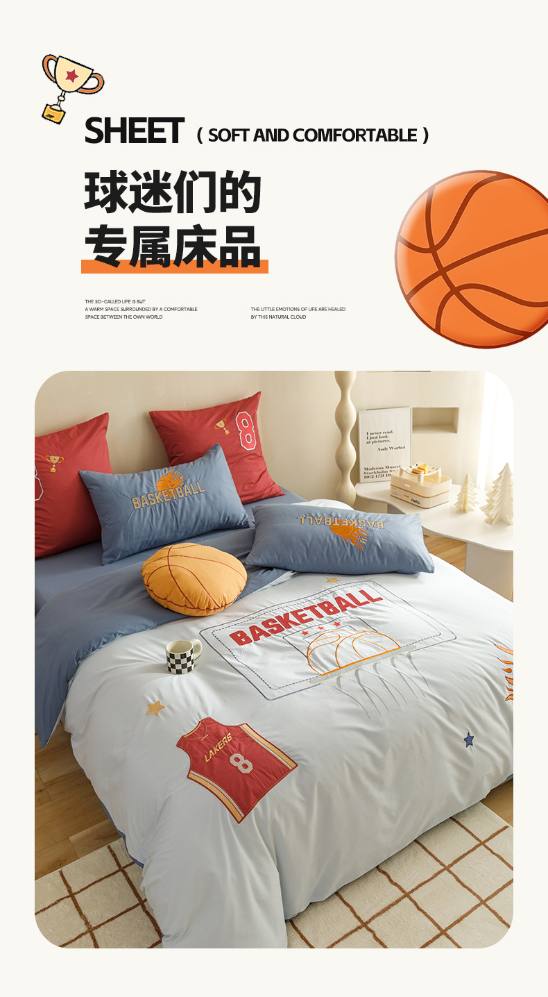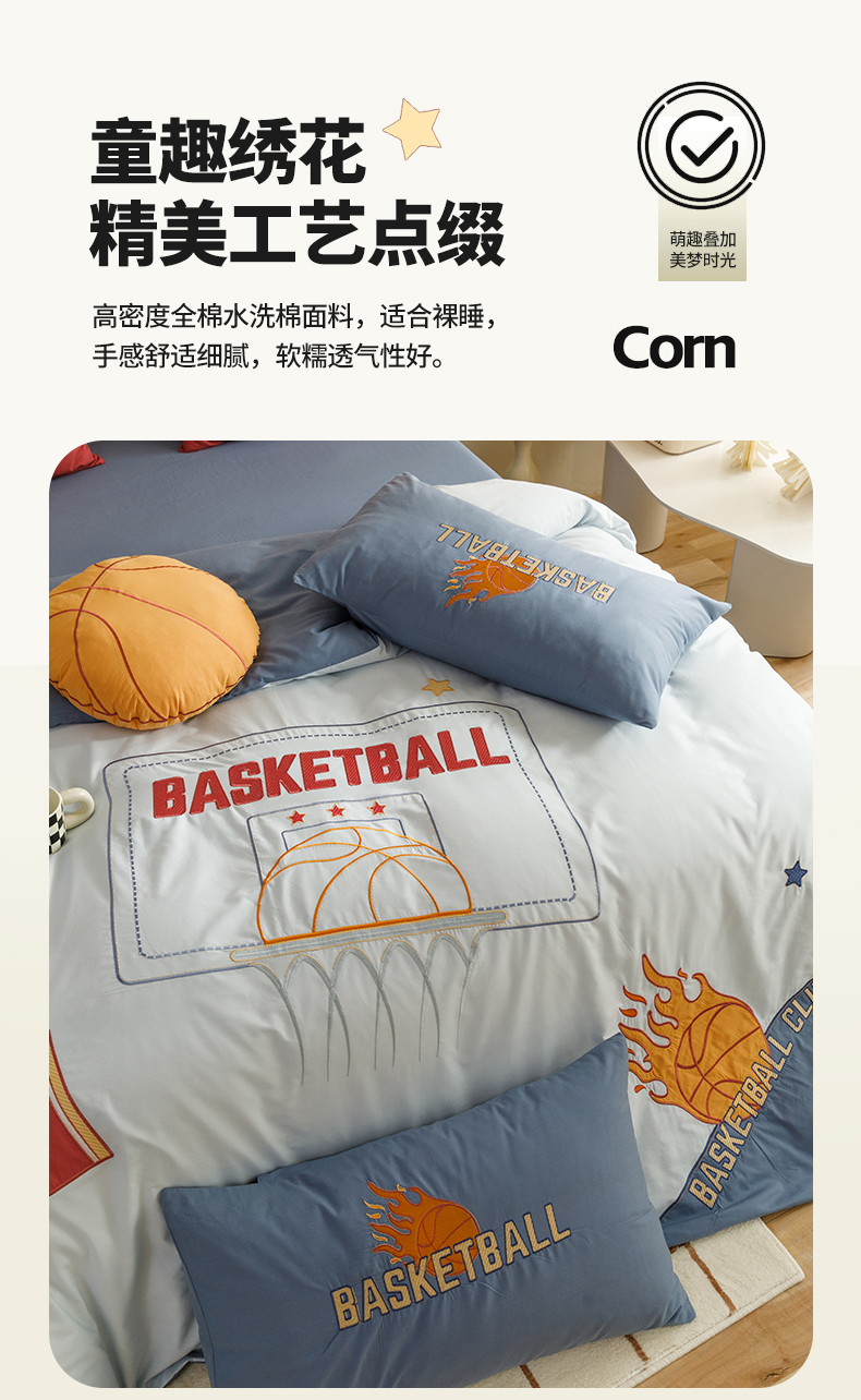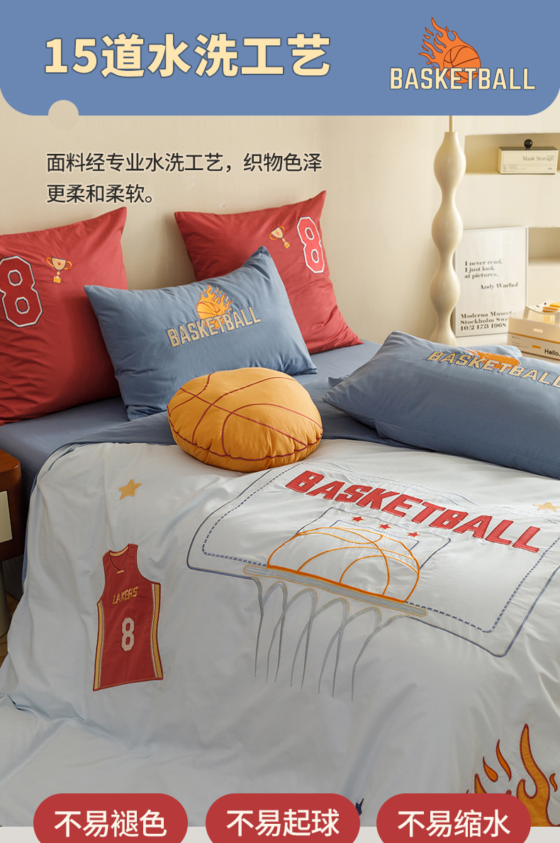 商品名称:绒梦里 2026新款A类全棉水洗棉卡通贴布绣套件三四件套 挚爱篮球-浅蓝