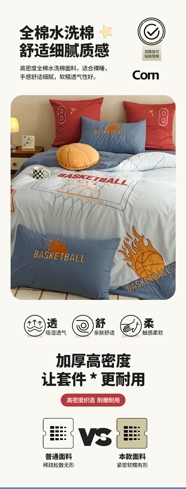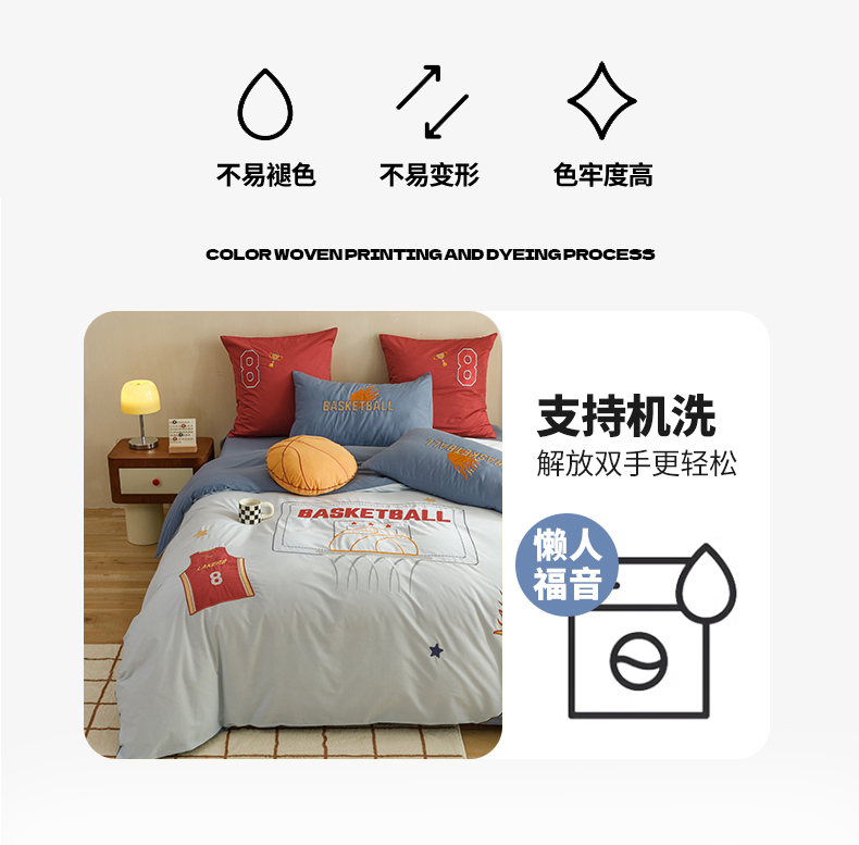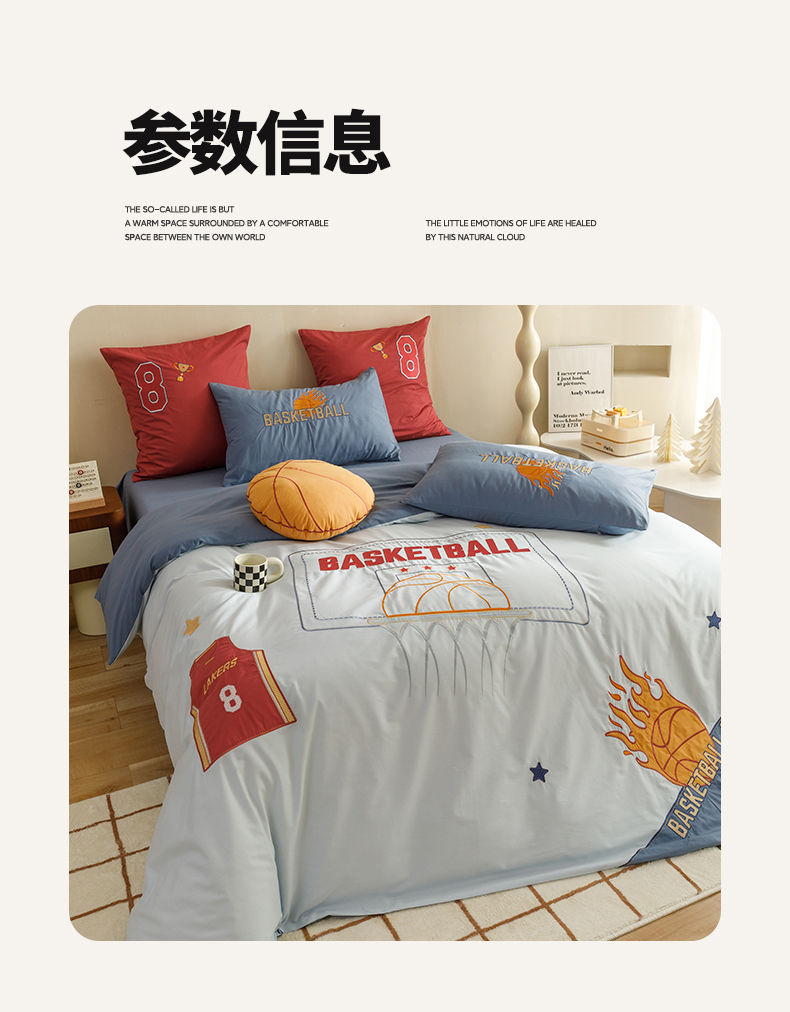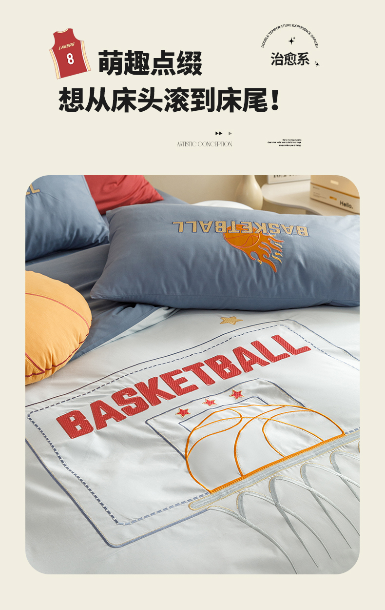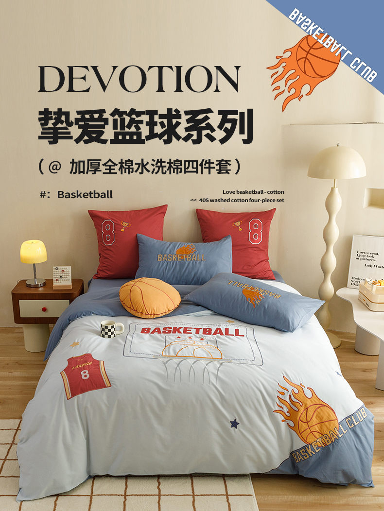 商品名称:绒梦里 2026新款A类全棉水洗棉卡通贴布绣套件三四件套 挚爱篮球-浅蓝