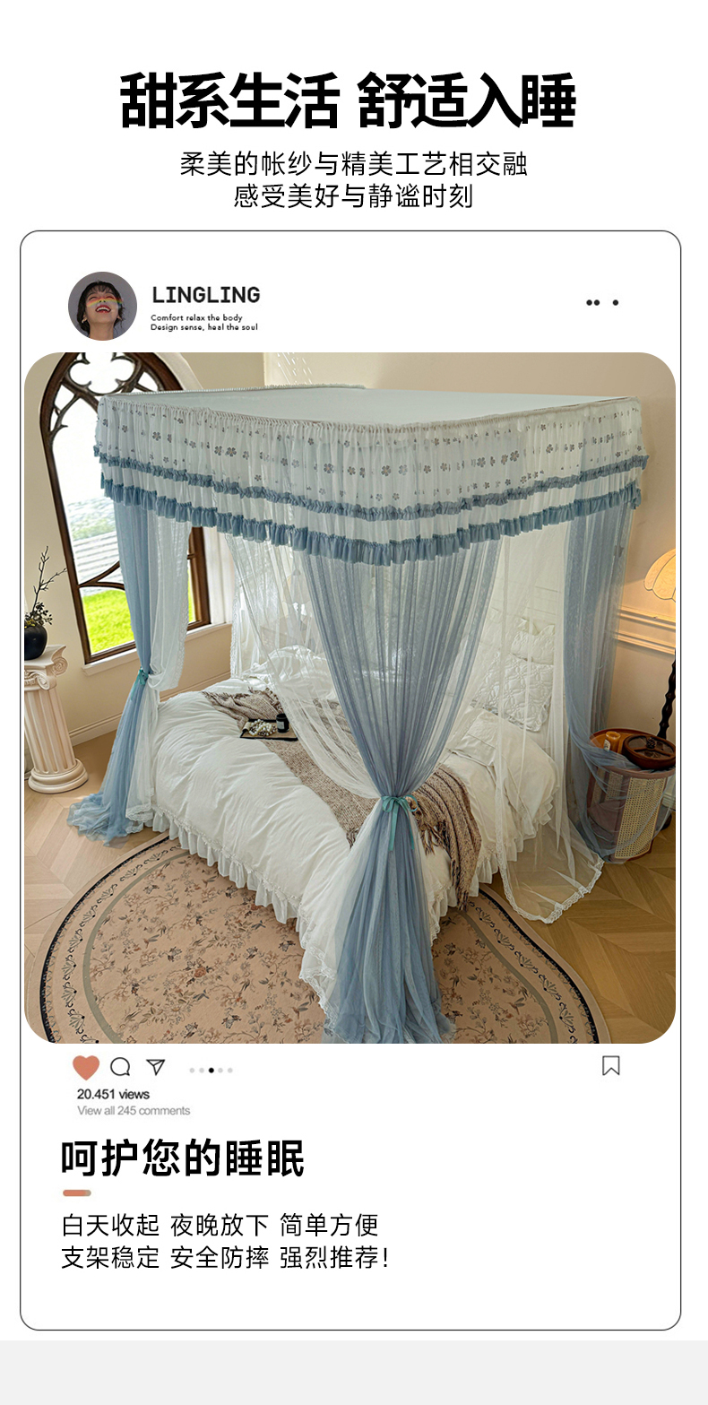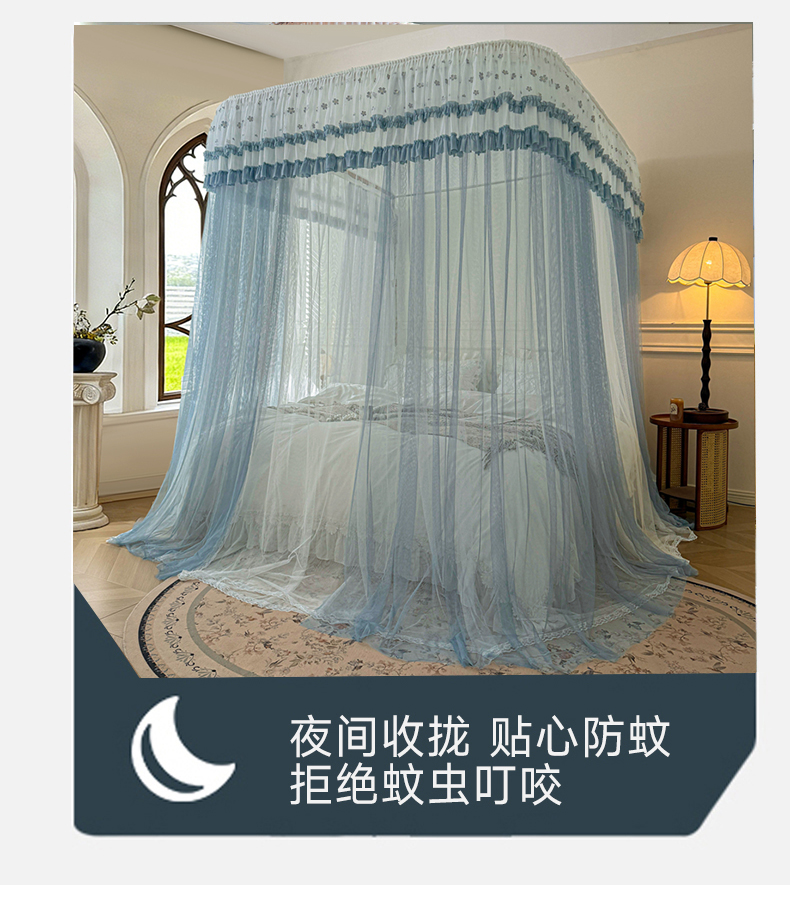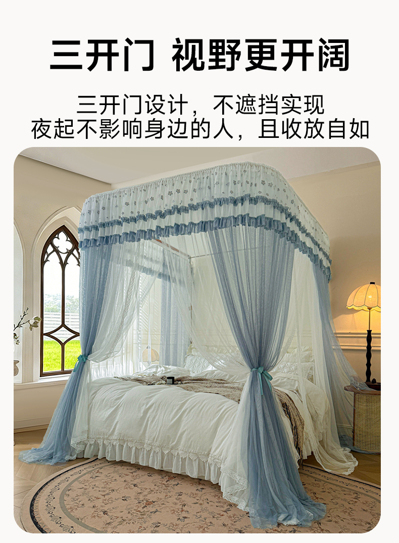 (总)2025新款双层花边全包围床笠款三开门蚊帐-幽梦星辰,奶黄,藕玉,颜淡蓝