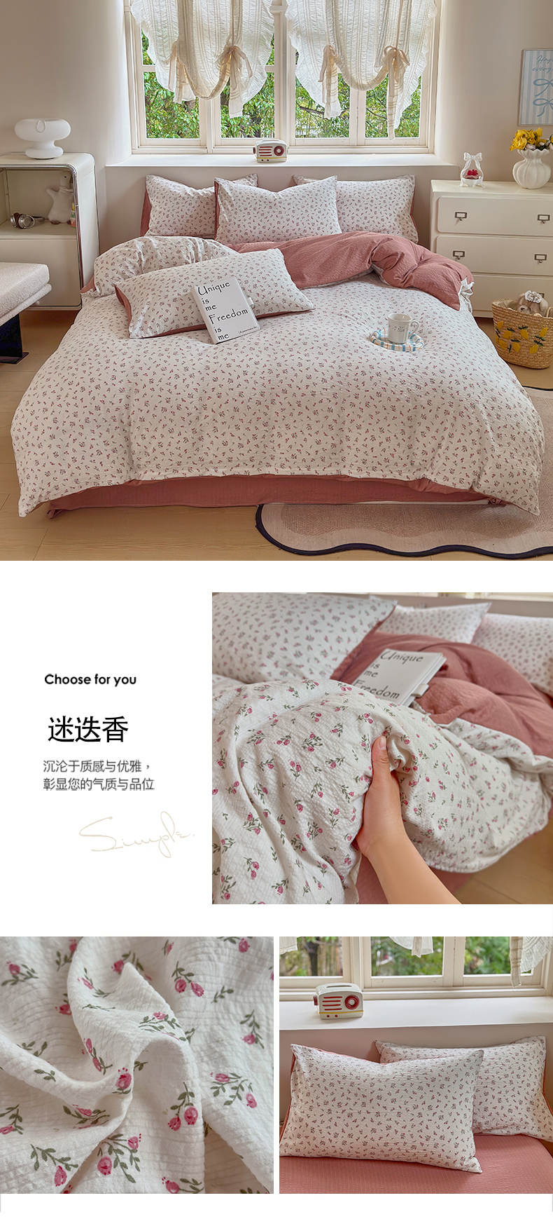 商品名称:(总)桔禾家纺 2026春夏新款小清新A类超柔泡芙棉泡泡纱双层纱四件套