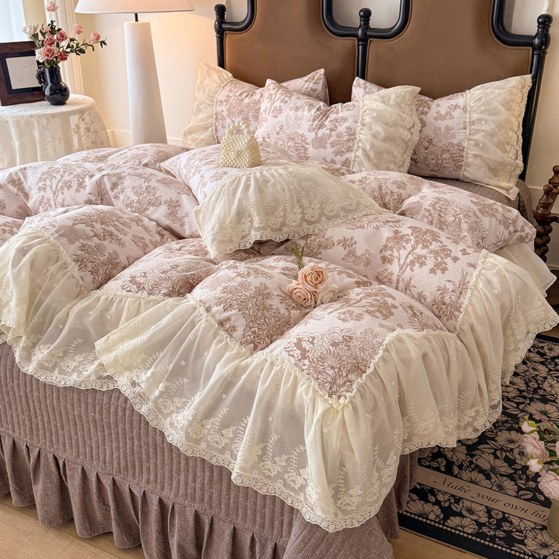 漫布云2026春夏新款法式复古双层花边大蕾丝水洗棉亚麻床盖款四件套全棉纯棉印花小碎花四件套 芙琳