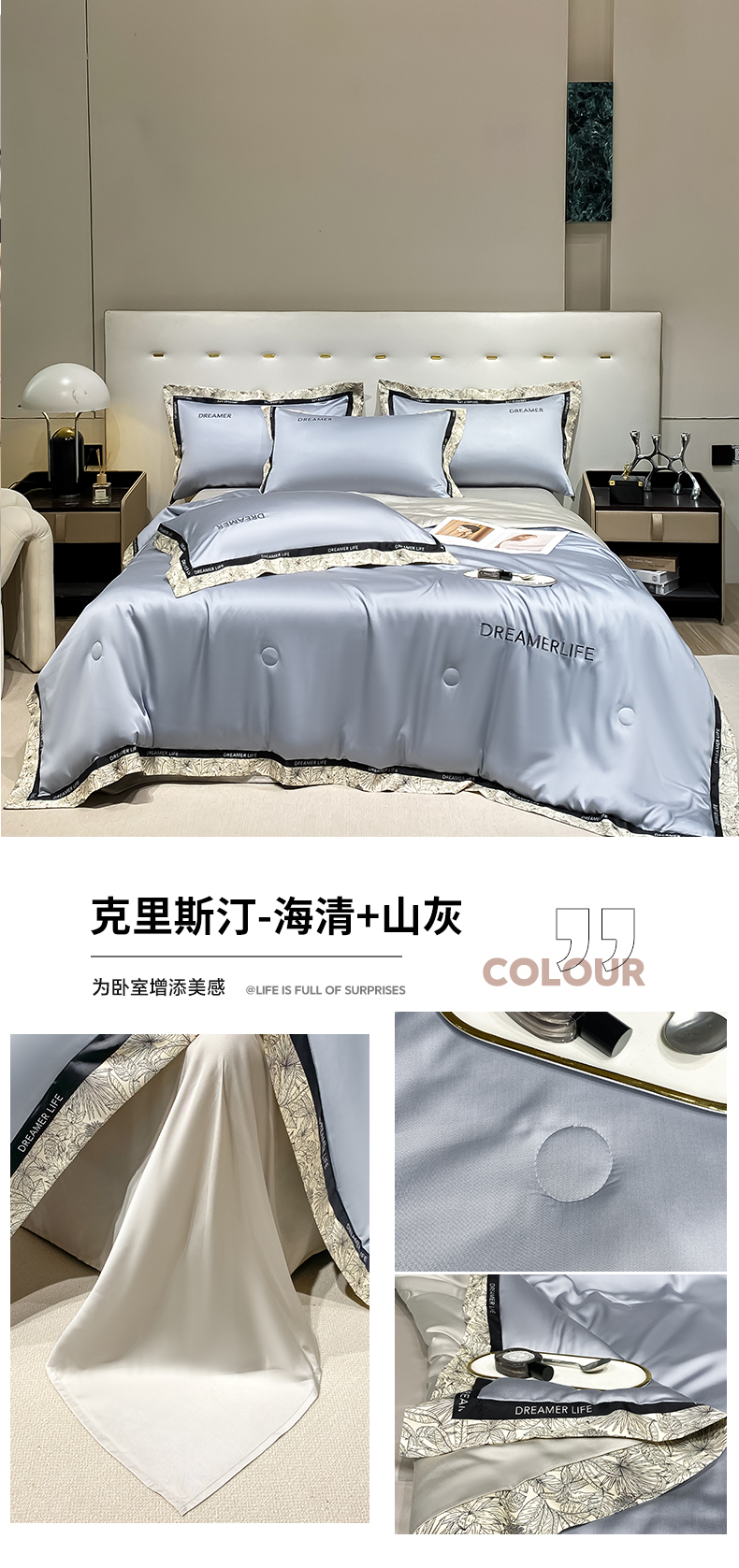 (总)眷恋家纺 2025春夏新款双拼纯色60天丝夏被四件套,灰蓝色-冰川灰,满天星紫-曙光银,浅艾绿-香槟金,天青色-香槟金,野樱莓-芋泥灰,月光色-岩石灰,芝士黄-沙茶色,芝芝桃桃-极地白