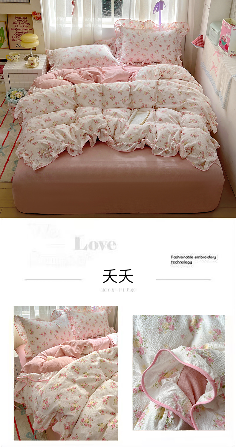 商品名称:睡美美家纺 2026新款皱皱纱肤感花边四件套 桃乐丝