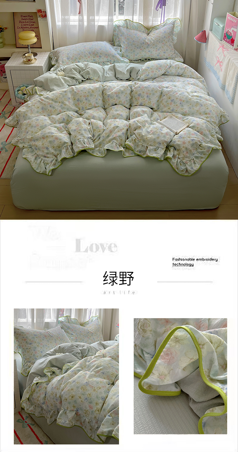 (总)睡美美家纺 2026新款皱皱纱肤感花边四件套,百福蓝,绿野,梦境织格,摩卡樱桃,桃乐丝,夭夭,莹光,旧梦蔷薇,紫风铃