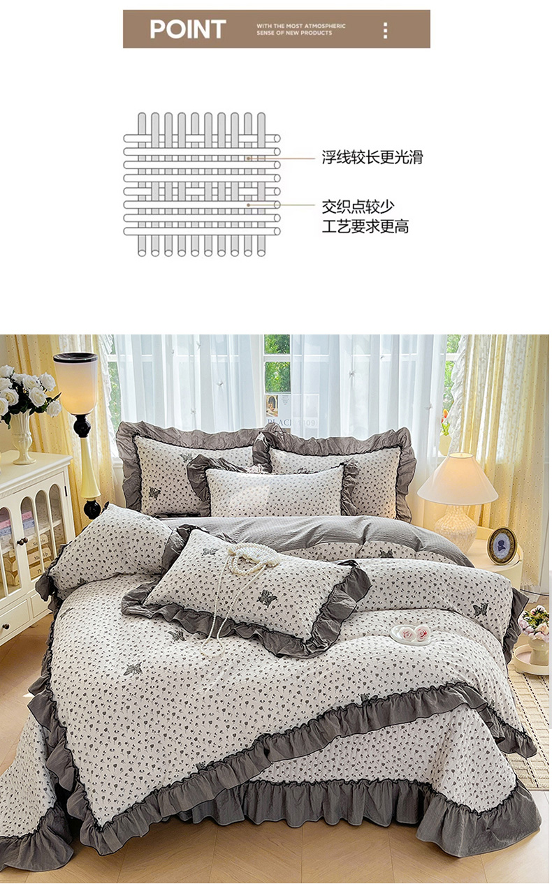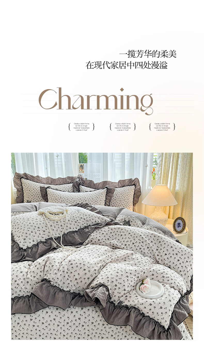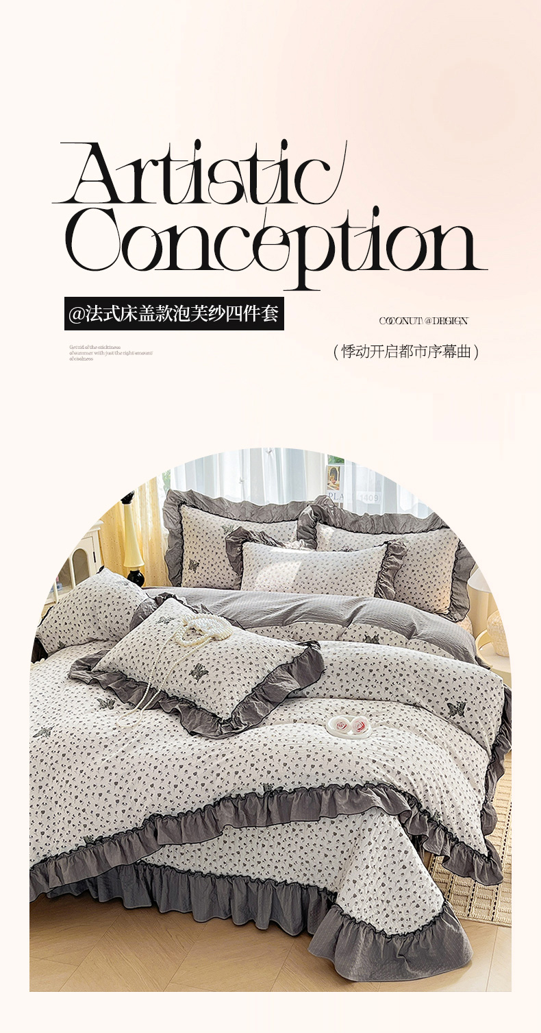 (总)妮恒美 2026新款法式床盖款泡芙纱四件套,爱意玫瑰,柔诗意,薇薇花语,蔷薇意语,木马格,幽幽花香,紫色豹纹,小樱桃,粉色回忆,兰亭序,浪漫花期,马上成功,萌萌凯蒂