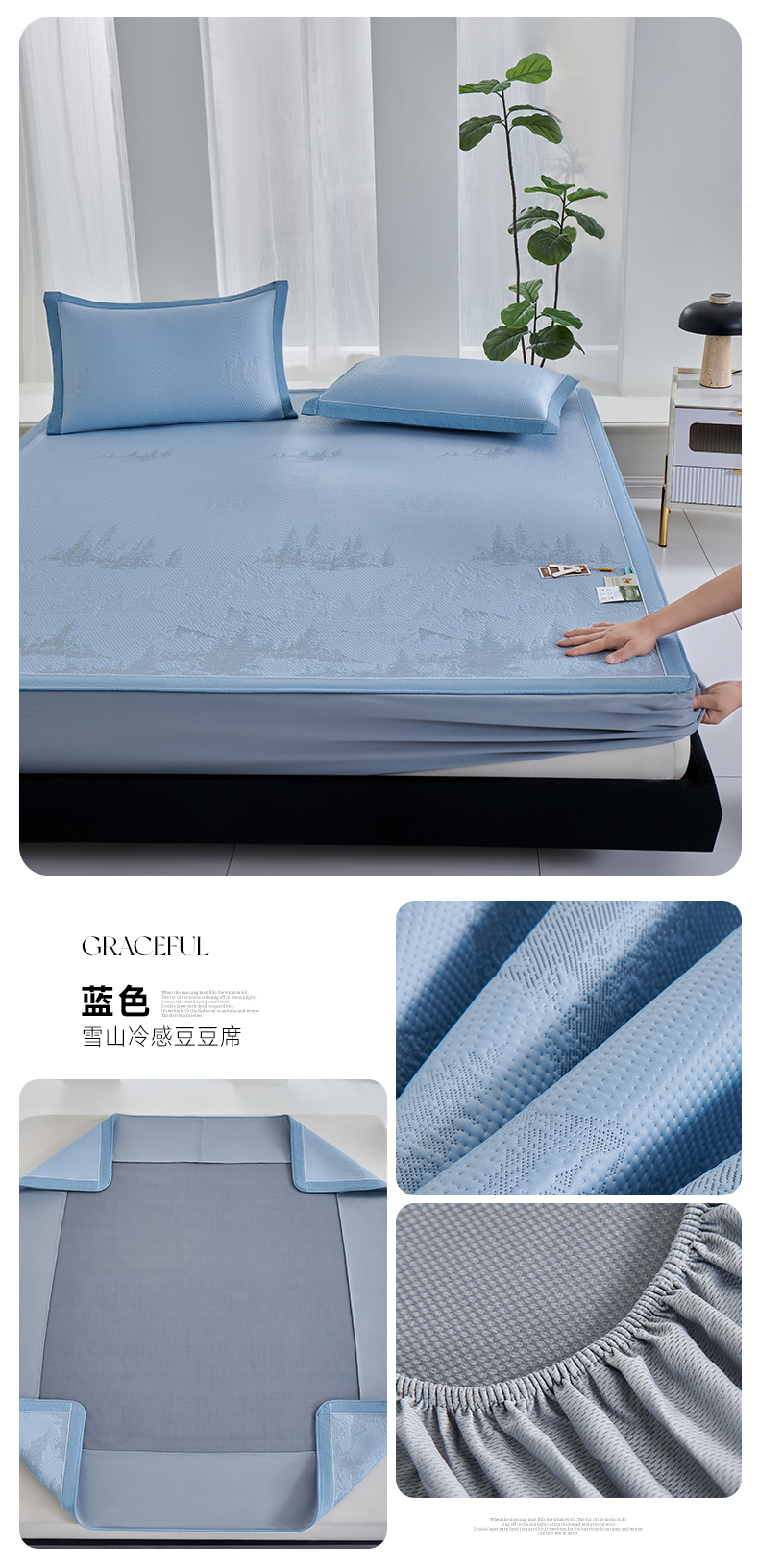 (总)2023新款超精密冰丝席-小斜纹系列-床笠款藤席凉席竹席,粉色,蓝色,绿色,银灰