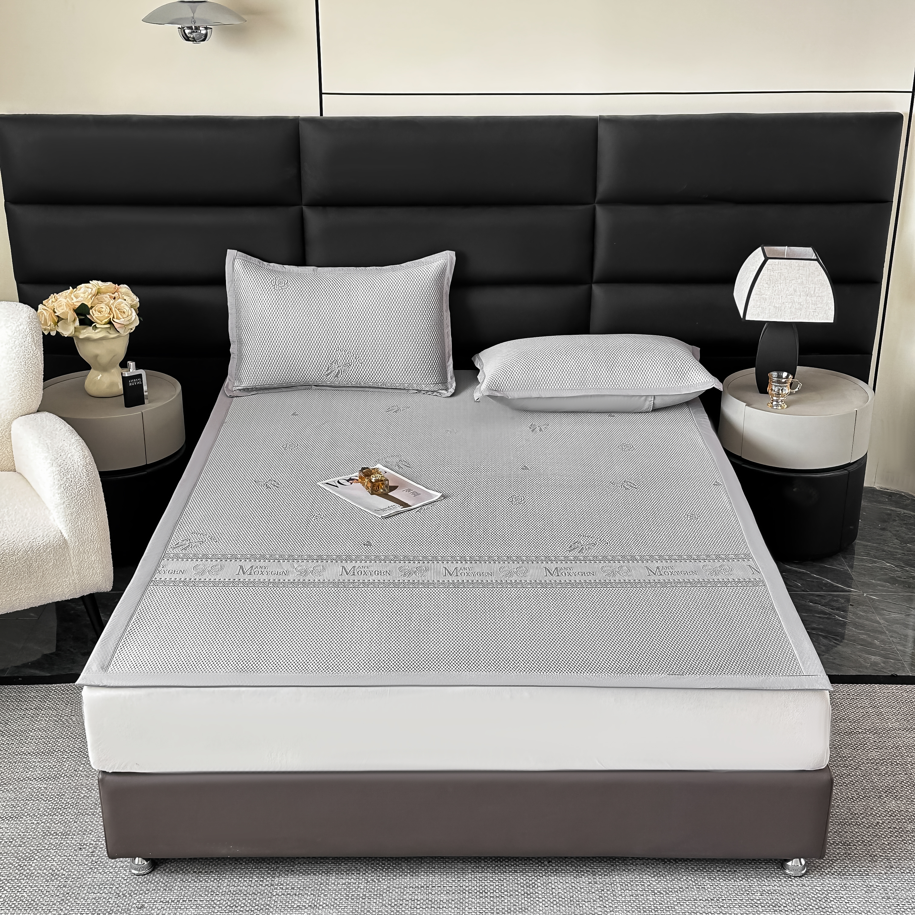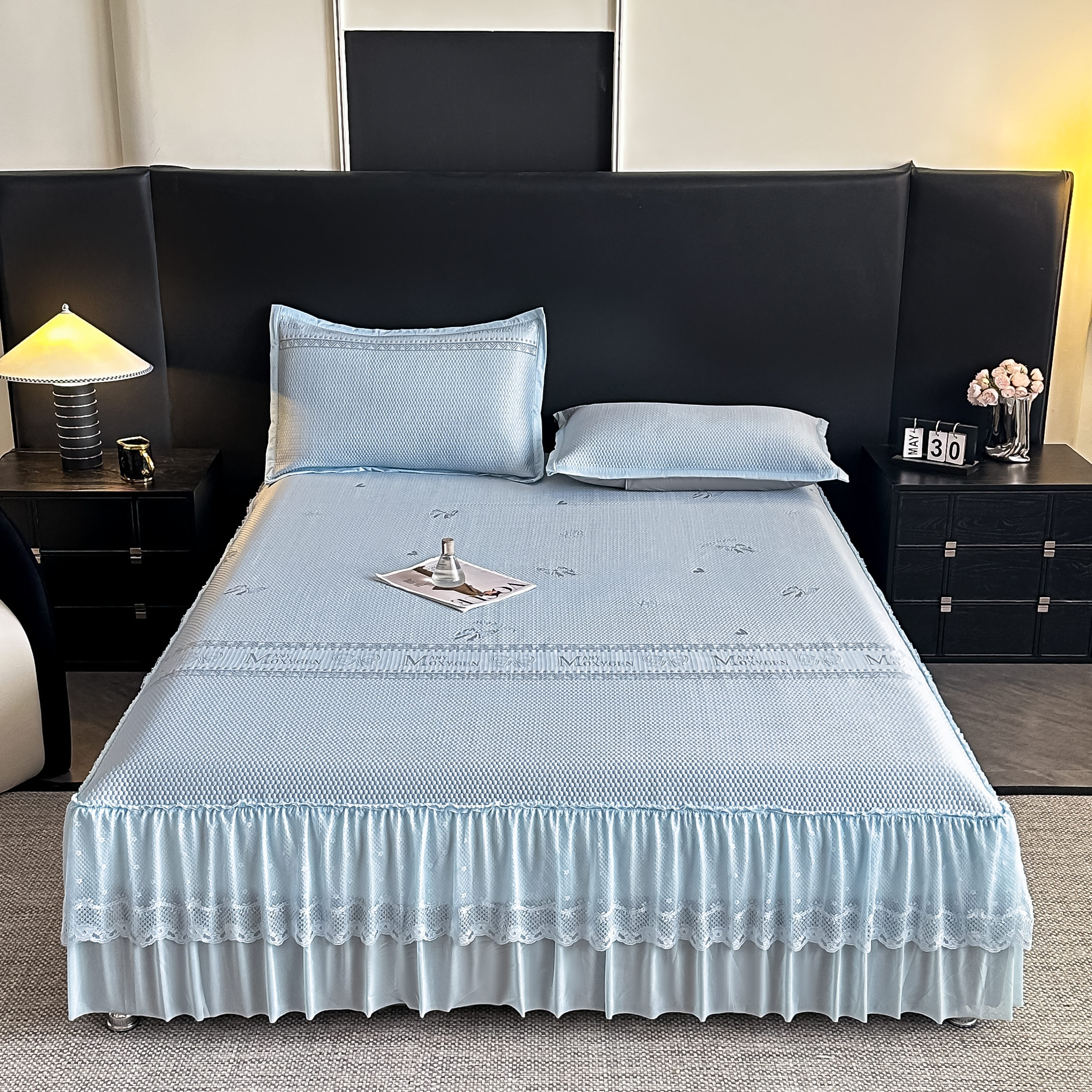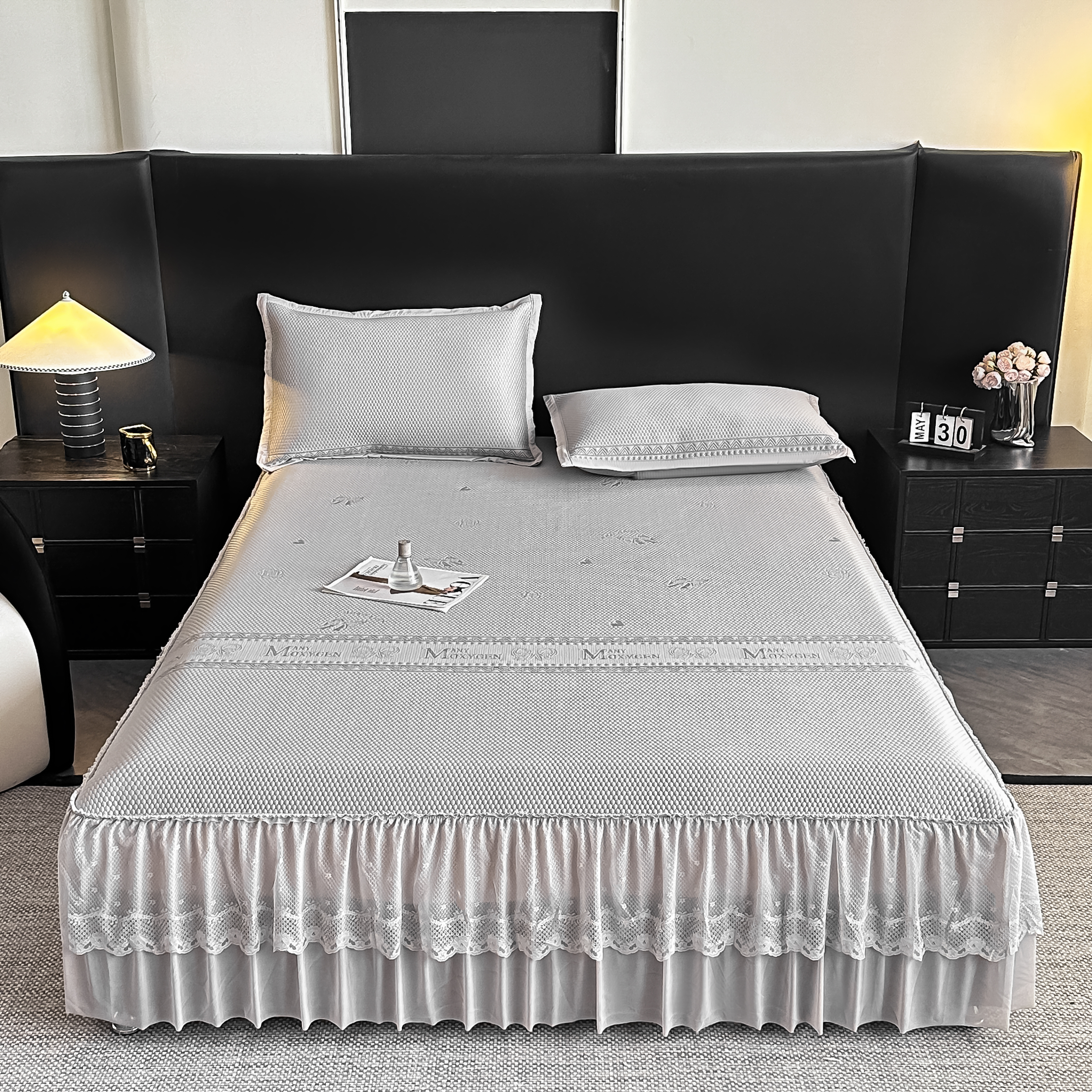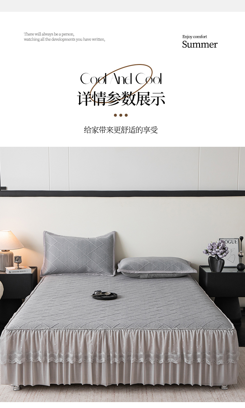 栩裕纺织 2026新款清纱菱纹床裙款豆豆席凉席 蝴蝶结灰